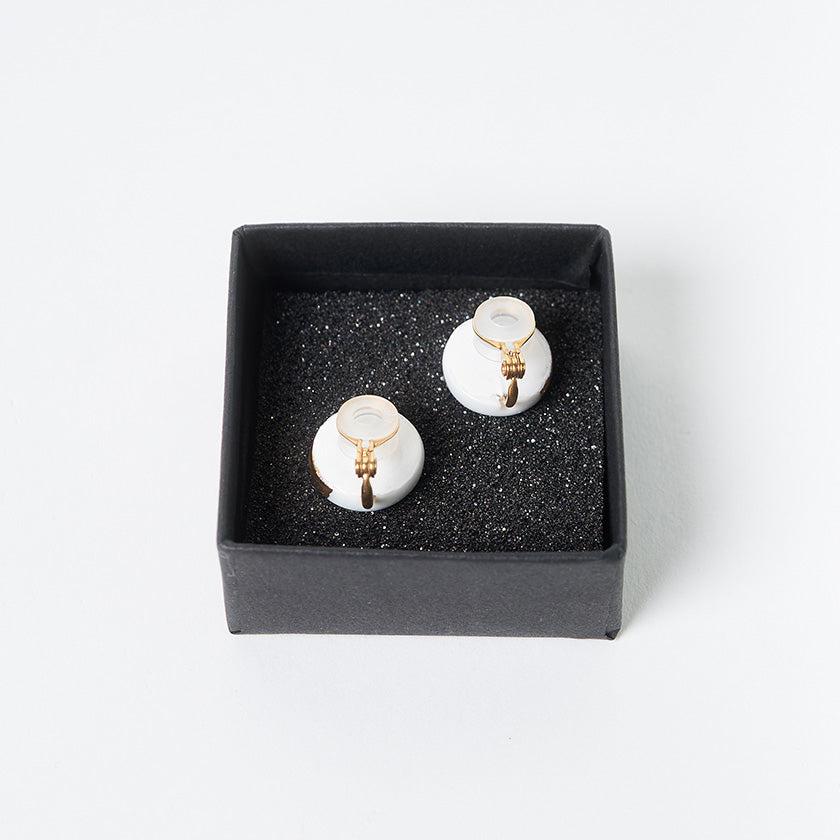イヤリングは本体が磁器製で、イヤリング金具の肌に触れる部分には樹脂パーツが採用されています。中央がくぼんだような樹脂パーツなので、耳につけると肌に吸い付くようで安定感が生まれます。樹脂はやわらかく、肌にやさしいのもうれしいですね。一方の磁器の本体は、肌に触れる面も光沢のあるつるりとした質感でとてもなめらかです。