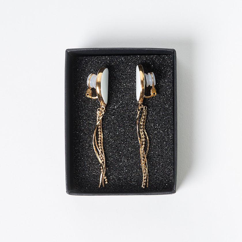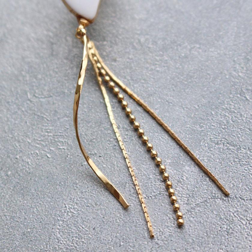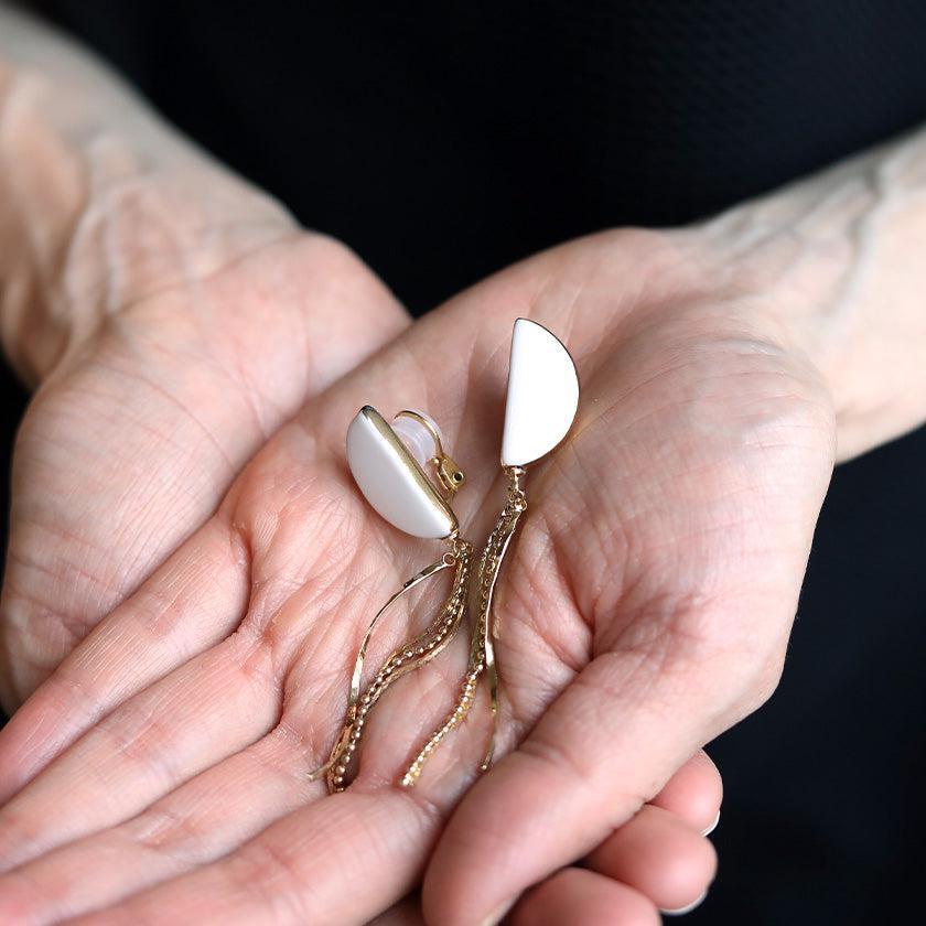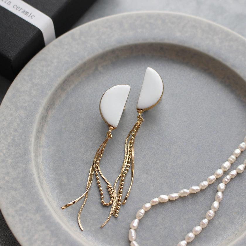 純白の半月に異なるチェーンタッセルが揺れるデザイン。