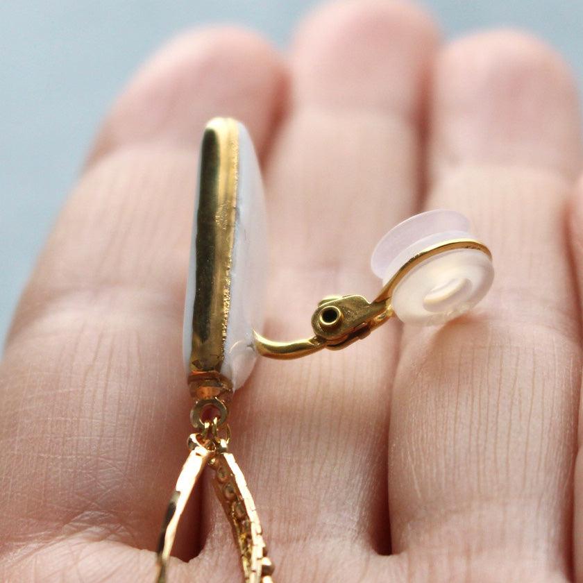 本体が磁器製で、イヤリング金具の肌に触れる部分には樹脂パーツが採用されています。中央がくぼんだような吸盤型の樹脂パーツなので、耳につけると肌に吸い付くようで安定感が生まれます。樹脂はやわらかく、肌にやさしいのもうれしいですね。一方の磁器の本体は、肌に触れる面も光沢のあるつるりとした質感でとてもなめらかです。