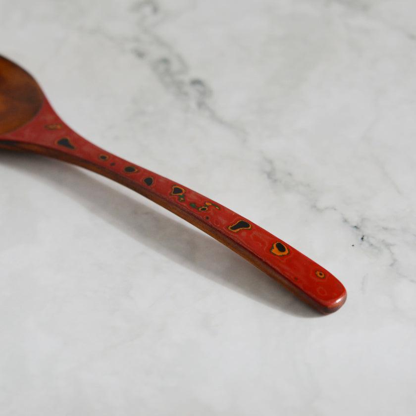 持ち手の部分に赤色の唐塗を施した目を引くデザイン。それ以外は木目を生かした拭き漆で仕上げています。