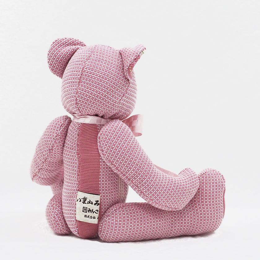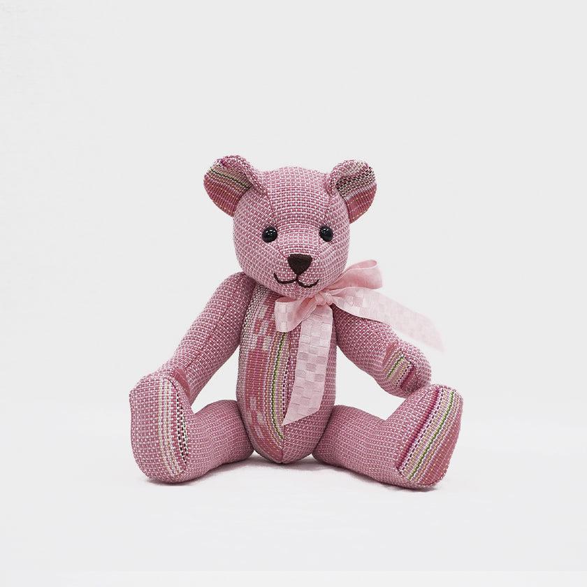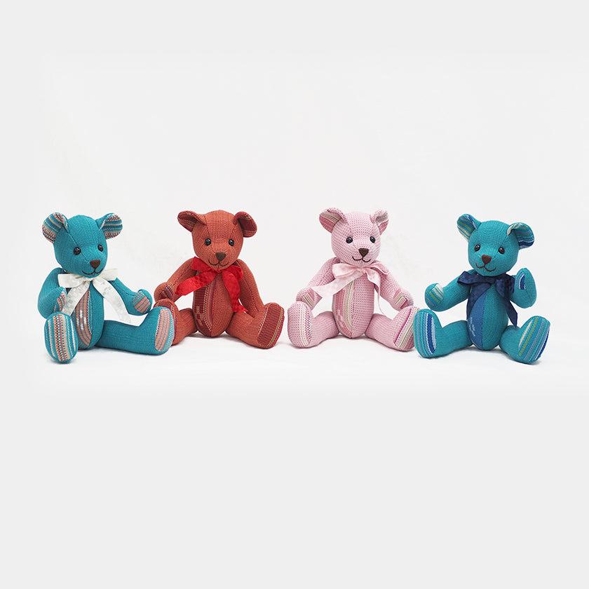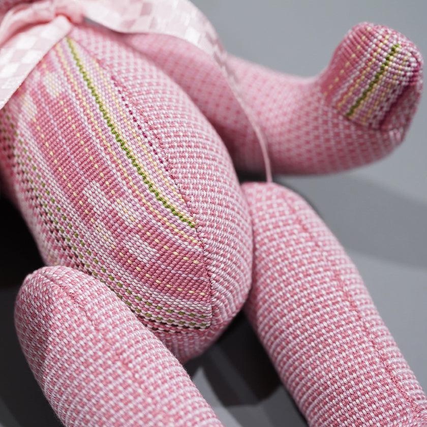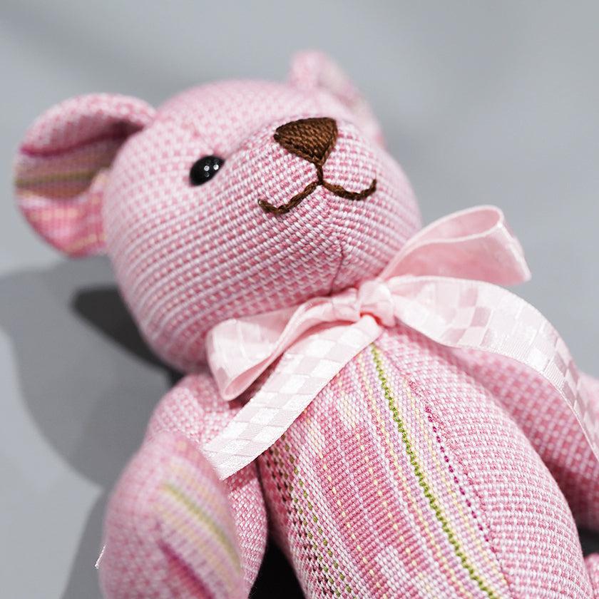 手織りの生地からパーツを切り出し、柄を合わせながら表情あるテディベアを製作しました。