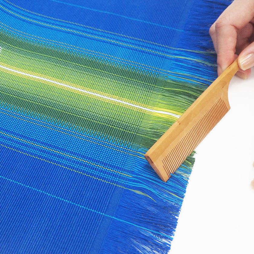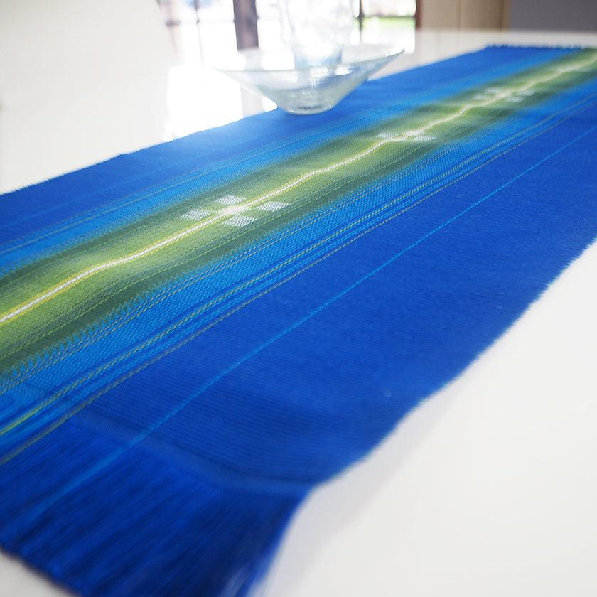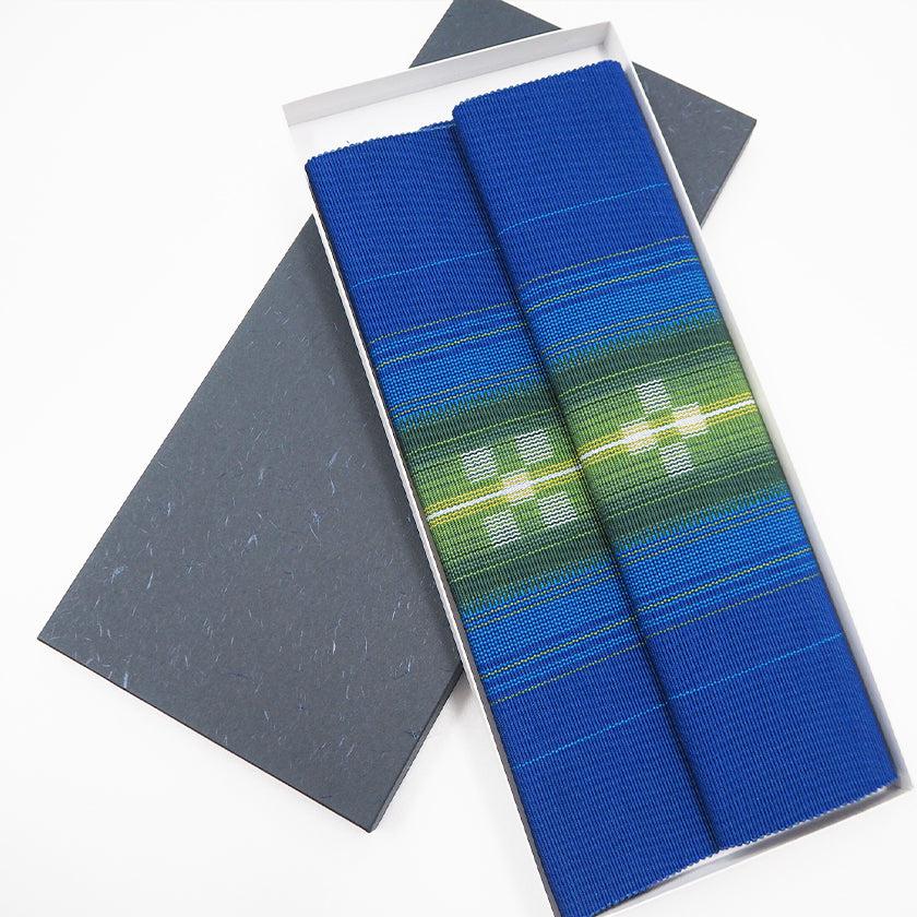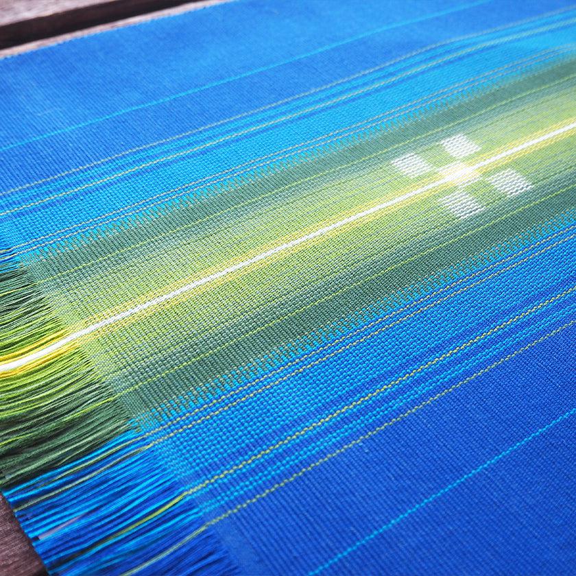 八重山の島々を包む雄大で穏やかな海の青のグラデーションと、珊瑚礁をモチーフにした深い色味が情緒深く、丹念に織り上げられた手織り生地なのでとても丈夫です。