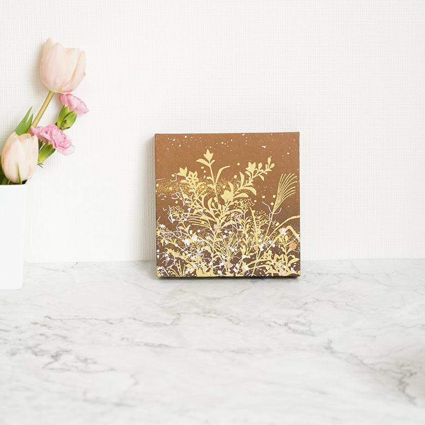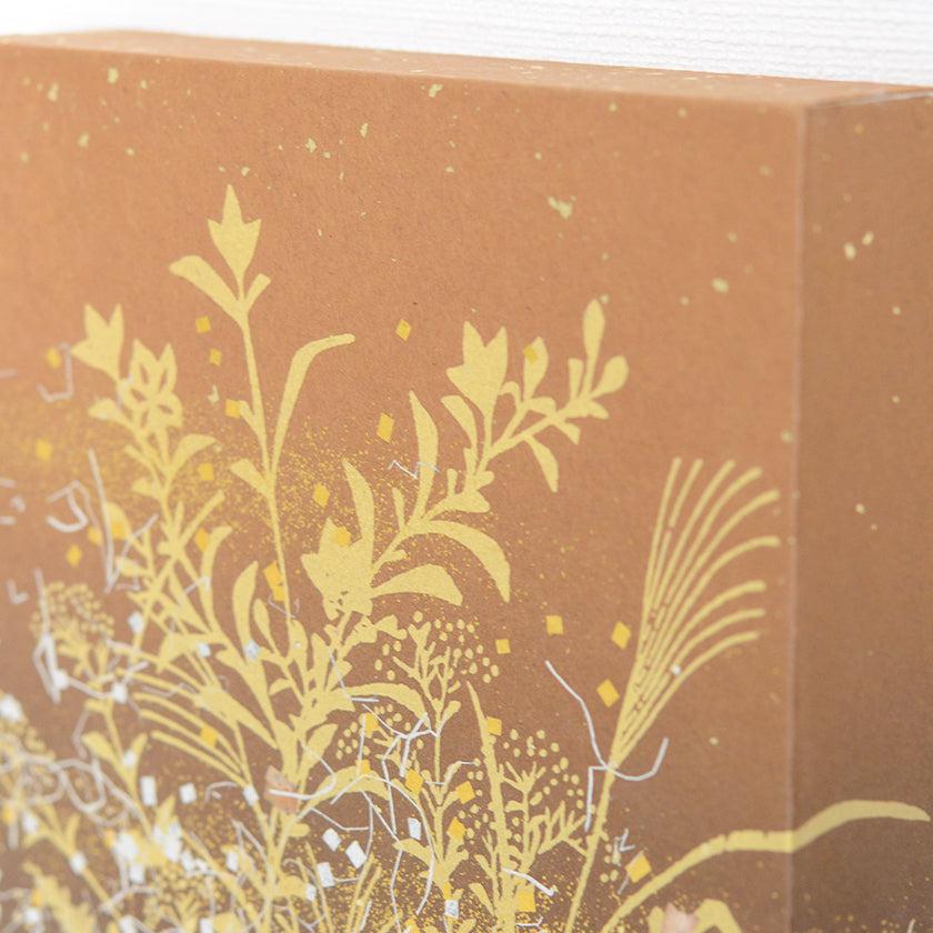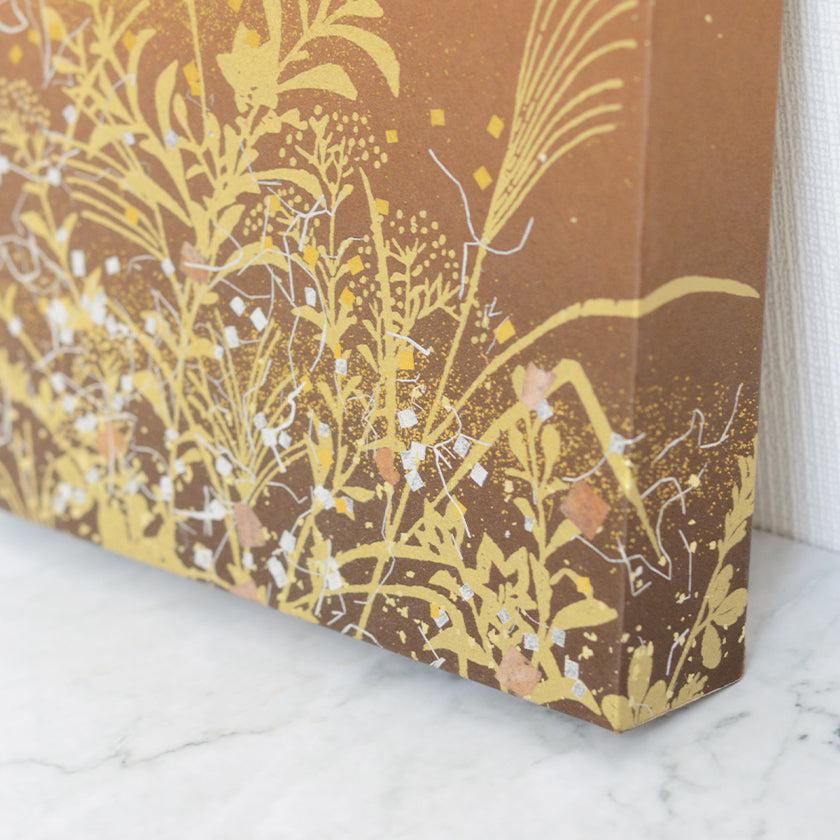 日本古来から伝わるふすま紙の伝統加飾技法「金銀砂子細工」を用い、秋草の桔梗やススキ、女郎花などの植物と月と立ち込める夜霧を1枚のパネルに表現しました。