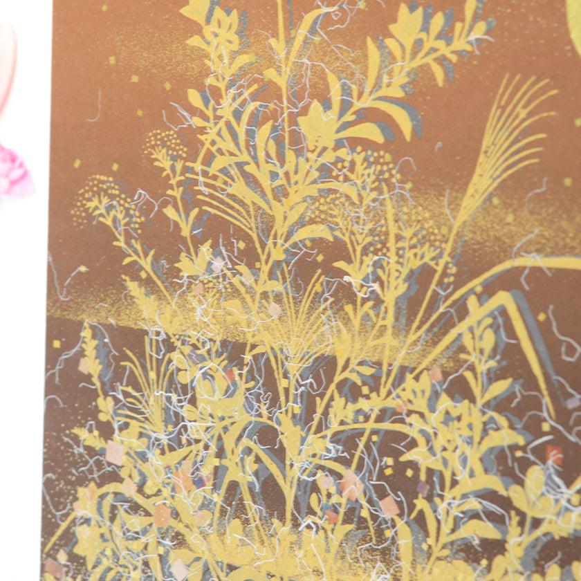日本古来から伝わるふすま紙の伝統加飾技法「金銀砂子細工」を用い、秋草の桔梗やススキ、女郎花などの植物と月と立ち込める夜霧を1枚のパネルに表現しました。