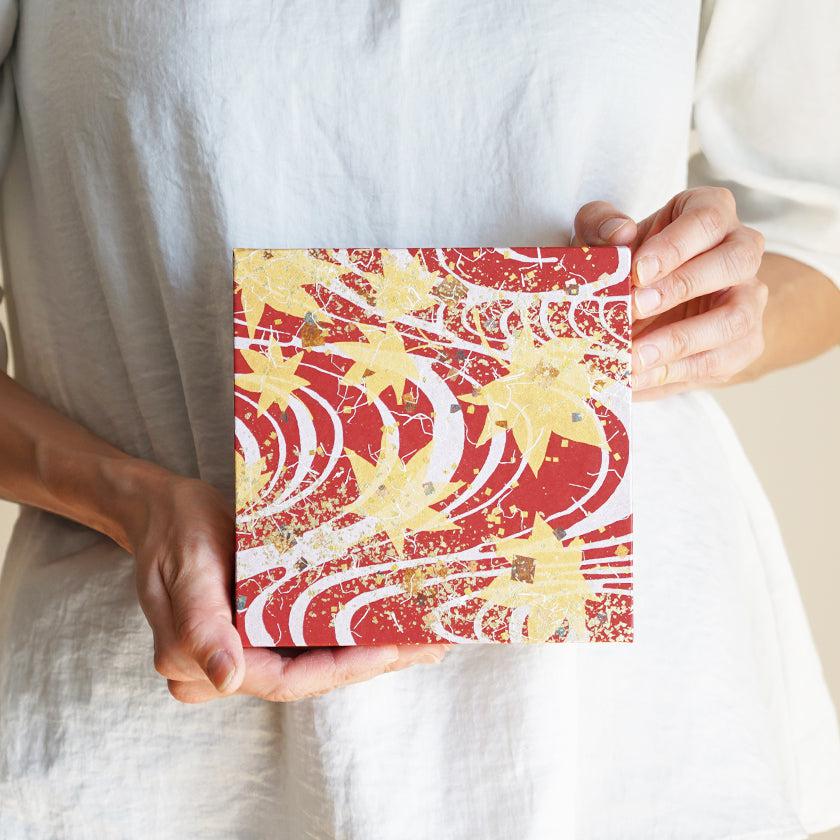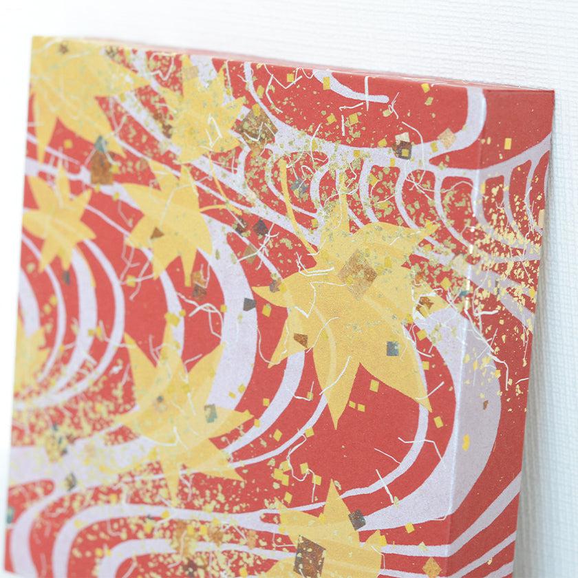 日本古来から伝わるふすま紙の伝統加飾技法「金銀砂子細工」を用い、和歌に多く詠まれた竜田川の美しい秋の景色を1枚のパネルに表現しました。