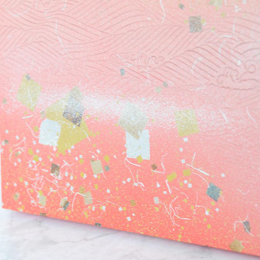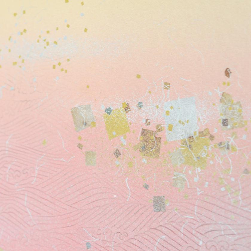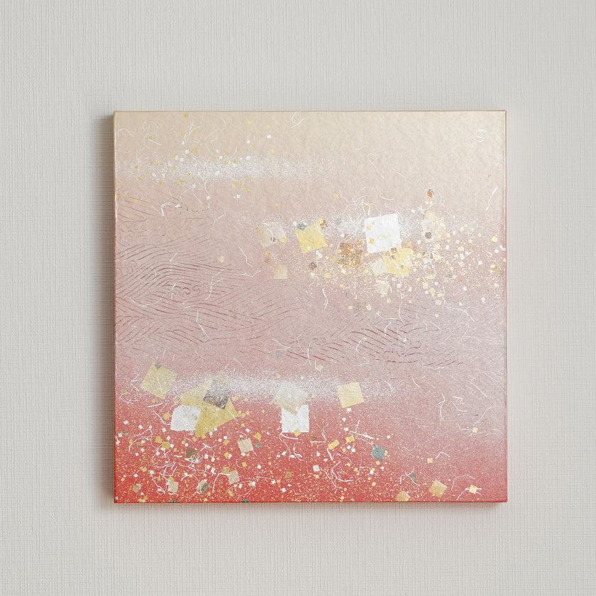 日本古来から伝わるふすま紙の伝統加飾技法「金銀砂子細工」を用い、おめでたい宝船の渡ってくる海を「魔除けの赤」と「豊かさの金」の色で1枚のパネルに表現しました。