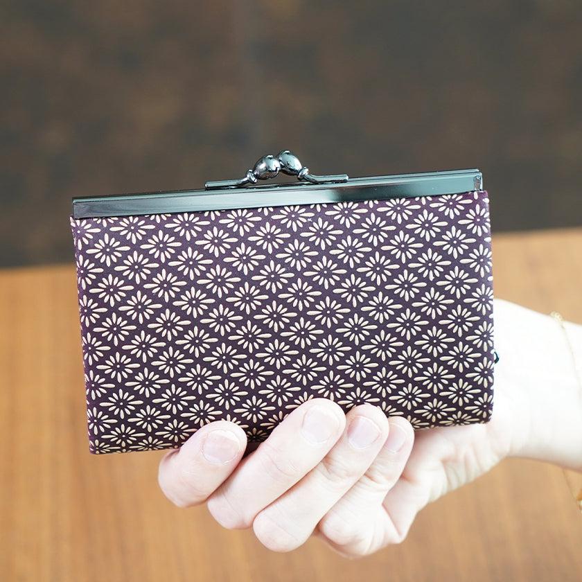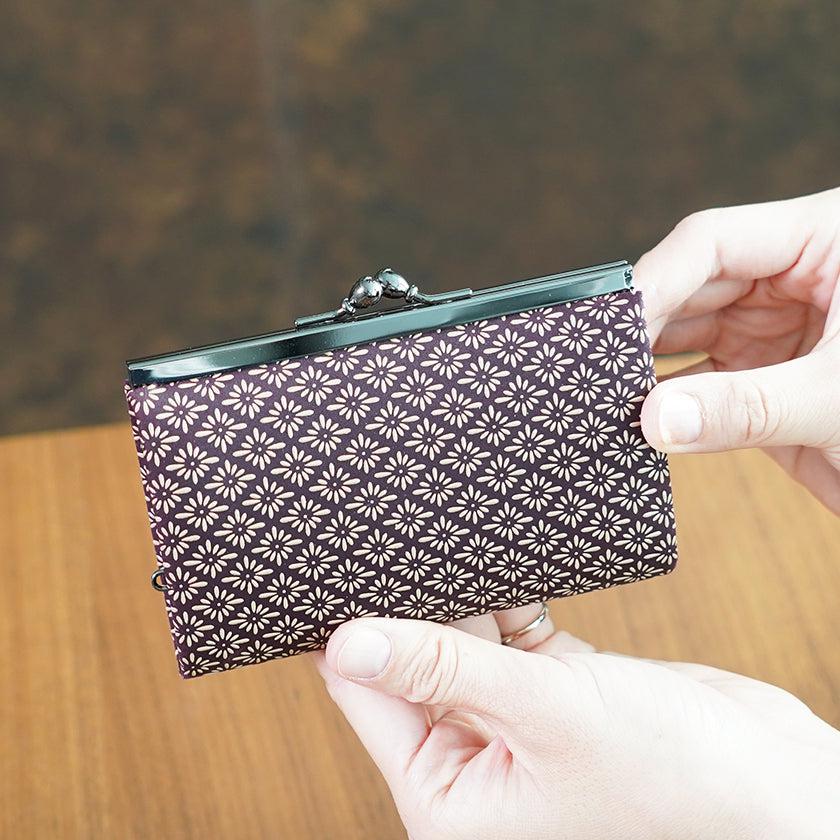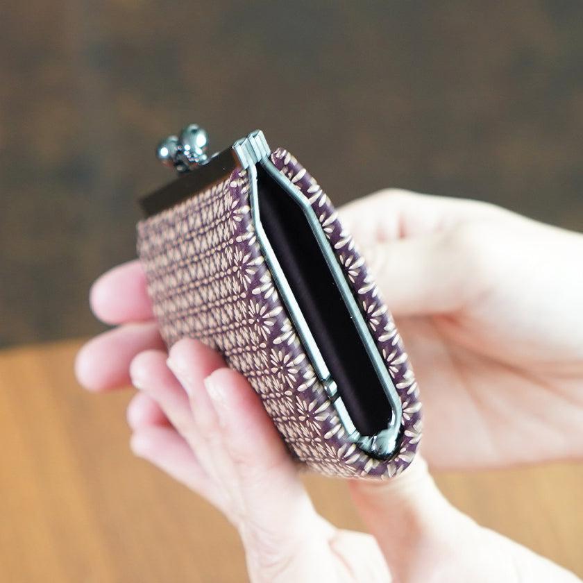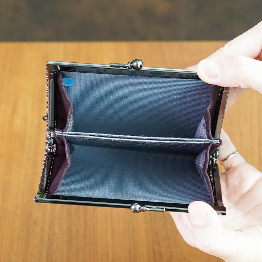 がま口式で大きく開き、中央に仕切りがあるので、お札と小銭を分けて収納できます。