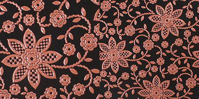 黒く染めた滑らかな鹿革にピンクの漆で文様を施した華やかな伝統工芸品です。