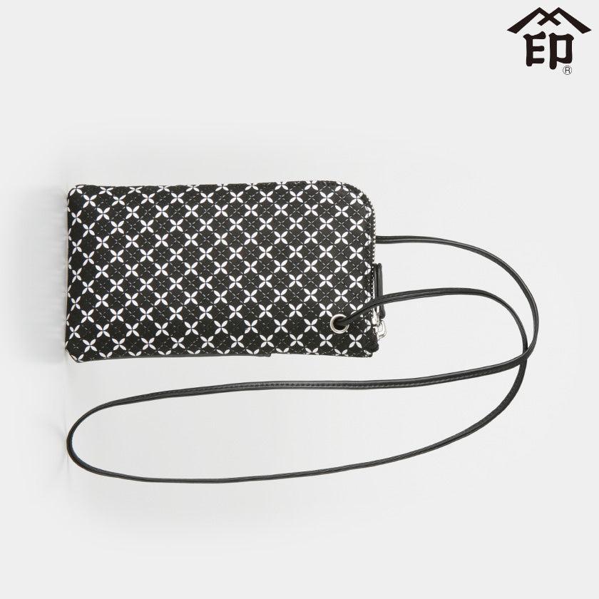 白更紗と黒漆で描かれたL字ファスナー式のスマホポシェットは、内外にポケットを備え、カード類も整理しやすい設計です。