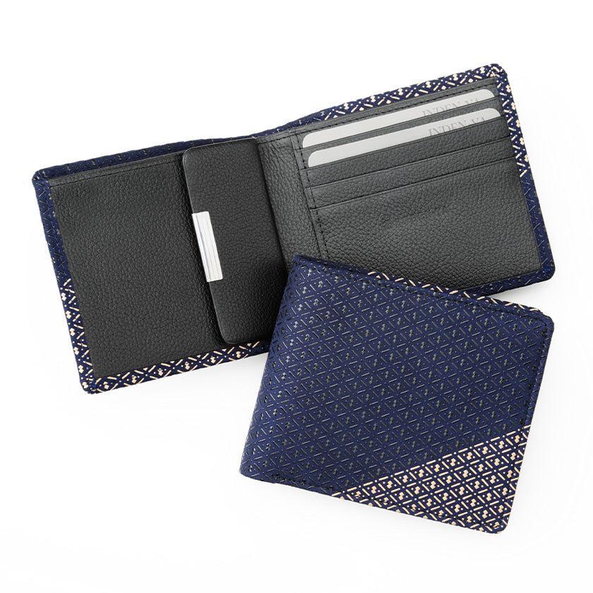紺地に黒と白の漆で描かれたバイカラーの二つ折り財布は、札入れのほかにカード入れ×4、ポケット×2、さらにホック留めの小銭入れを備えているので整理しやすいデザインです。