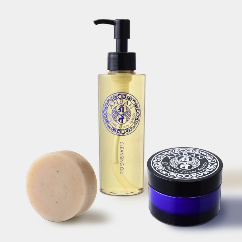 和漢植物を使ったスキンケアアイテムシリーズ、ANBAN(アンバン)のスキンケアアイテム3点セット。クレンジング・洗顔・保湿クリームの3ステップで、簡単にお肌のお手入れができるうれしいセットです。