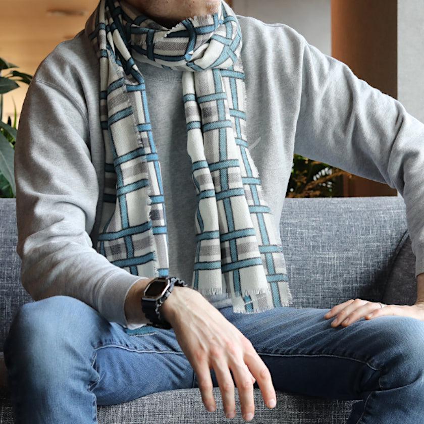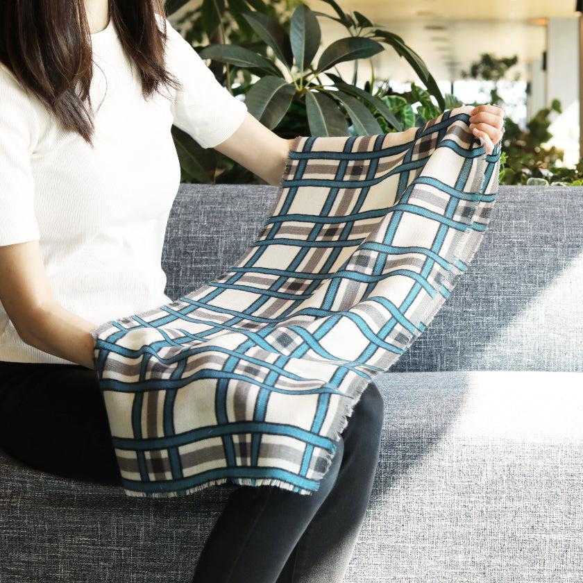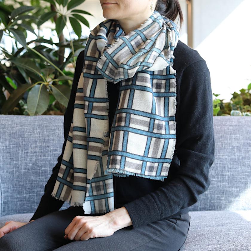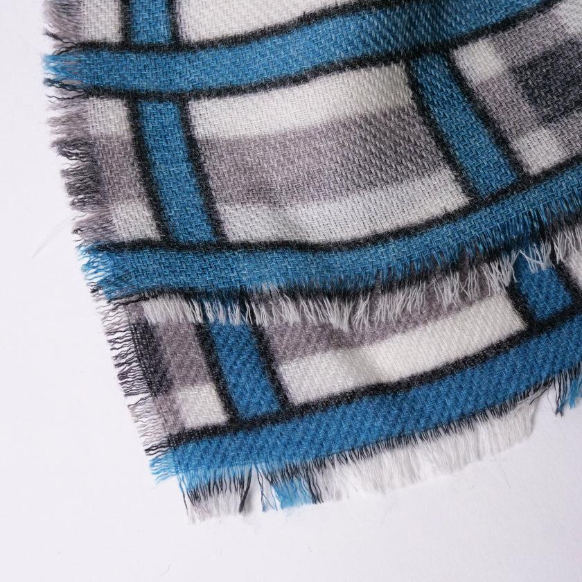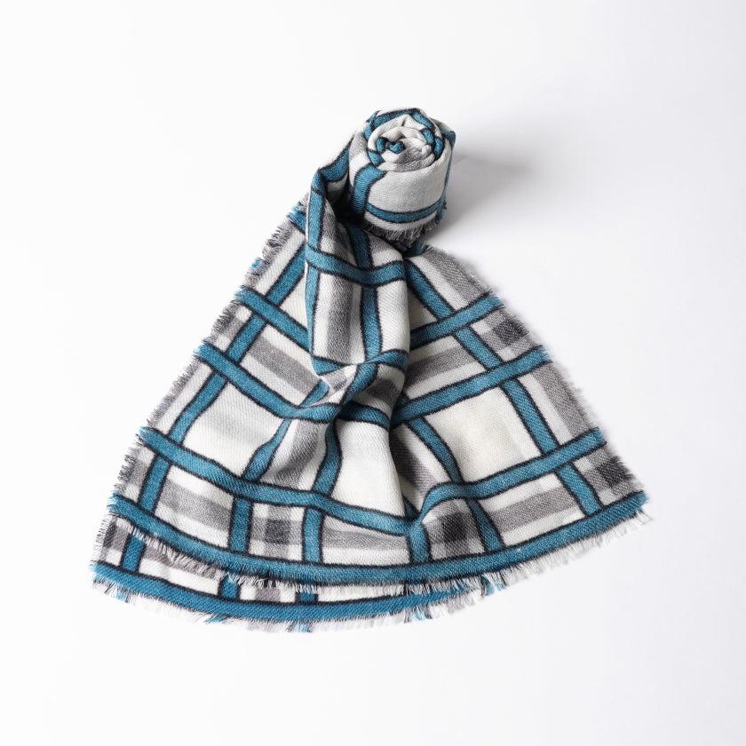 日本の伝統文様である格子柄を、天然ウールの白生地に青とグレーで描き、爽やかな印象に仕上げました。