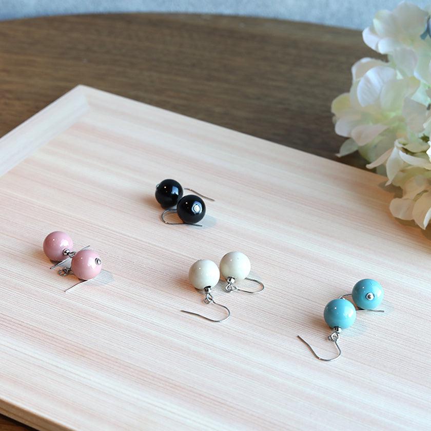 こちらのピアスは黒、ピンク、水色、ベージュの4色展開。漆といえば赤色や黒色が代表的ですが、肌馴染みの良い柔らかなカラーもラインナップされており、好みや使用シーンに合わせて選ぶことができます。