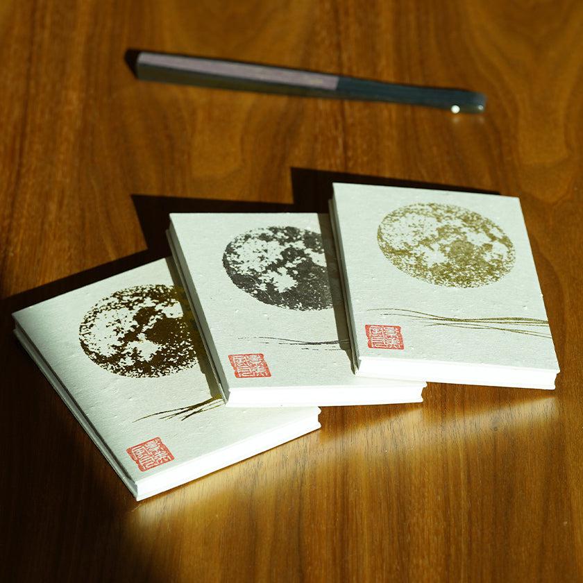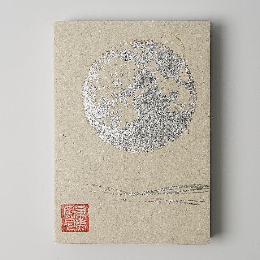 手漉き和紙に、版木に刷られた紋様を手刷りする、からかみの技法を用いて満月を刷りました。