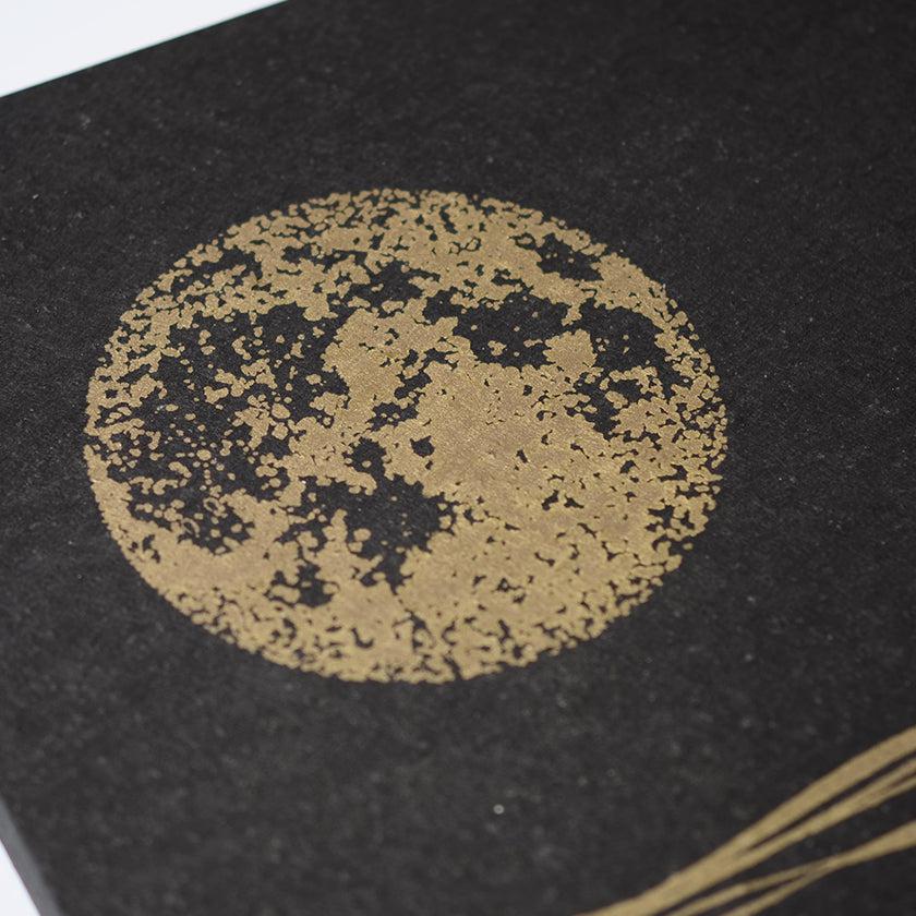 手漉き和紙に、版木に刷られた紋様を手刷りする、からかみの技法を用いて満月を刷りました。