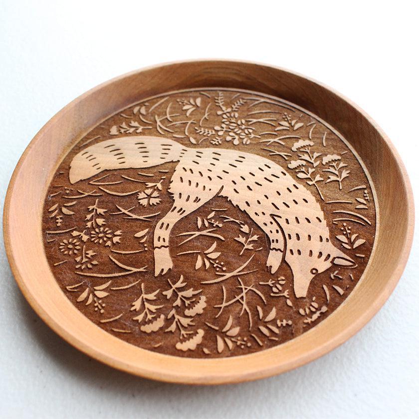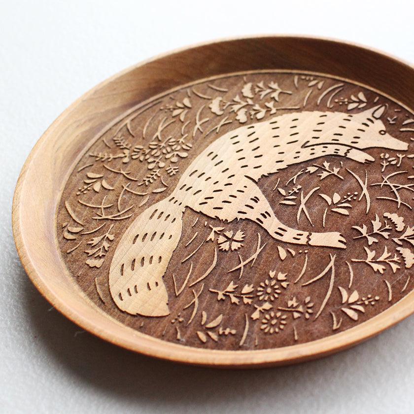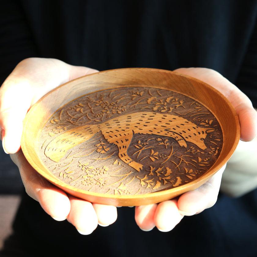 狐と秋草紋が繊細に描かれた木製のお皿。料理皿や取り皿、お茶請け用のお皿など毎日活躍する使い勝手のいいアイテムです。あたたかみにあふれていて、お子さまへのプレゼントや出産祝いにもおすすめ。小物を入れてインテリアアイテムとしてもおしゃれに使えますよ。
