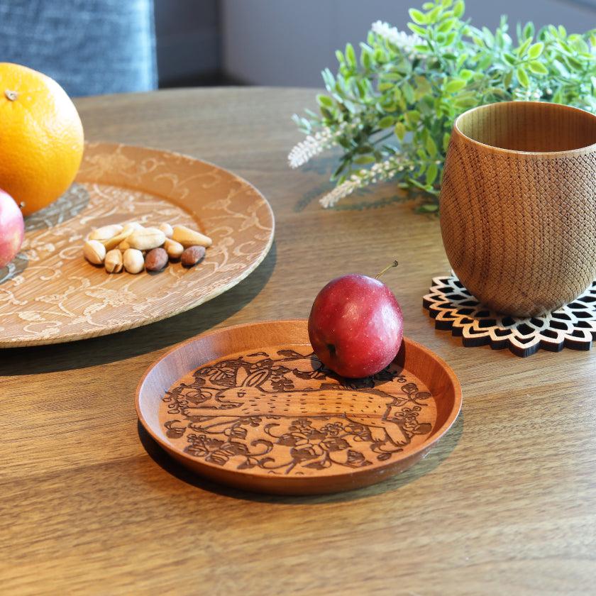 振袖の意匠である唐草紋様と兎のイラストをレーザー彫刻で描いた、飛躍と繁栄の願いがこめられた小皿です。