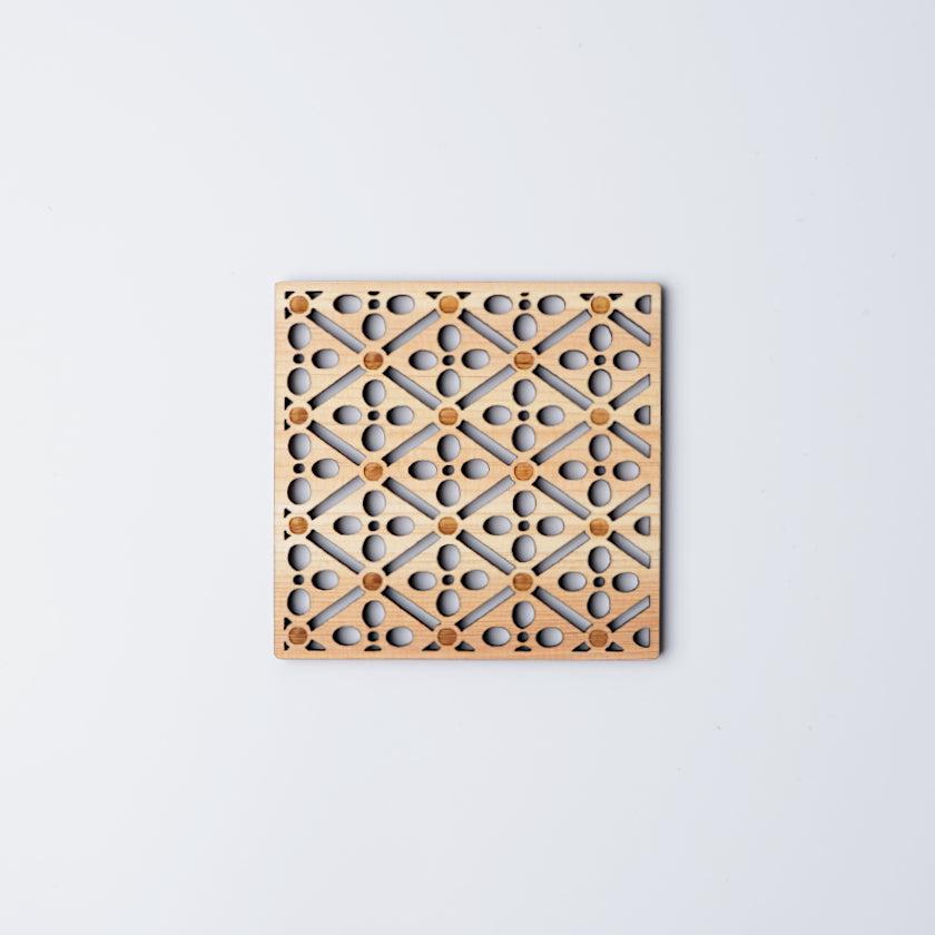 振袖に使用されている菱紋と梅の花を組み合わせて彫刻した檜のコースターです。
