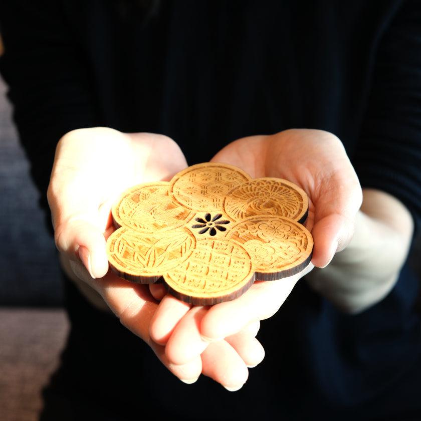 振袖に使用されている梅の形にカットし、花弁に鶴や竹などの小紋を施した檜のコースターです。