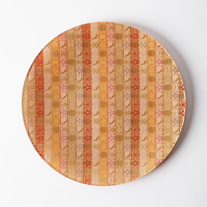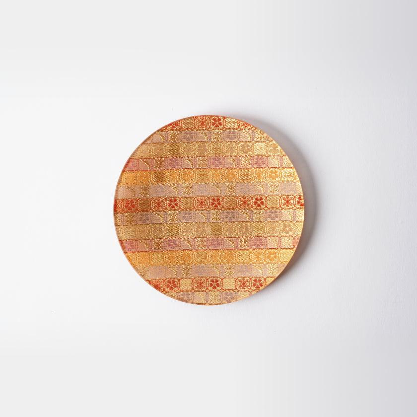 金銀糸をふんだんに使って花月の文様を織り込んだ西陣織の角皿です。
