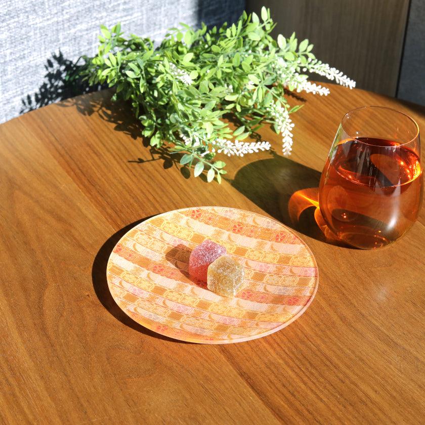 美しい織物をガラスとEVA樹脂で挟み込み、裏面には滑り止めや飛散防止加工を施して高い機能性を実現しました。。