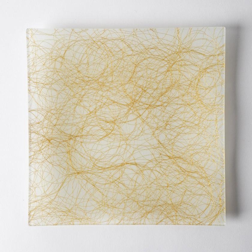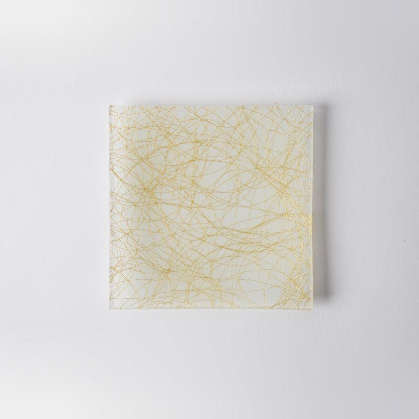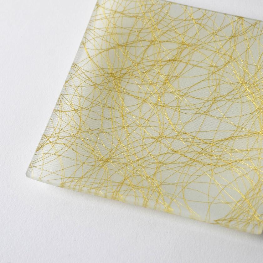 お皿に使われている西陣織は、ごく細い金糸と銀糸が不規則に織り込まれた、モダンなデザイン。全面に舞う糸は主張しすぎず、けれど全体を美しく彩っていて高級感にあふれています。