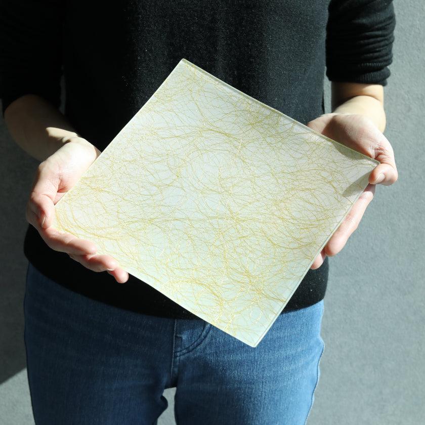 美しい織物をガラスとEVA樹脂で挟み込み、裏面には滑り止めや飛散防止加工を施して高い機能性を実現しました。