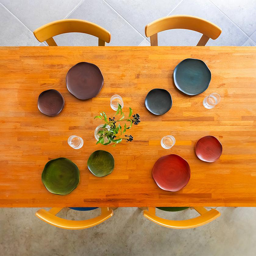 プレートは6色のカラー展開。赤みのあるベリー、赤ワインの色ようなライラック、漆黒のセサミ、黄色やオレンジを感じるミモザ、グリーンカラーのオリーブ、紺青のヒアシンス。どの色も生漆が透けてきたときに現れる下地の色を何度も試作し、鮮やかな色と自然な色ムラを目指して作られたこだわりのカラー。