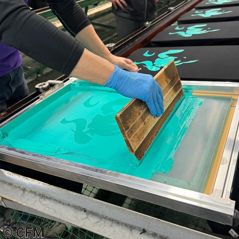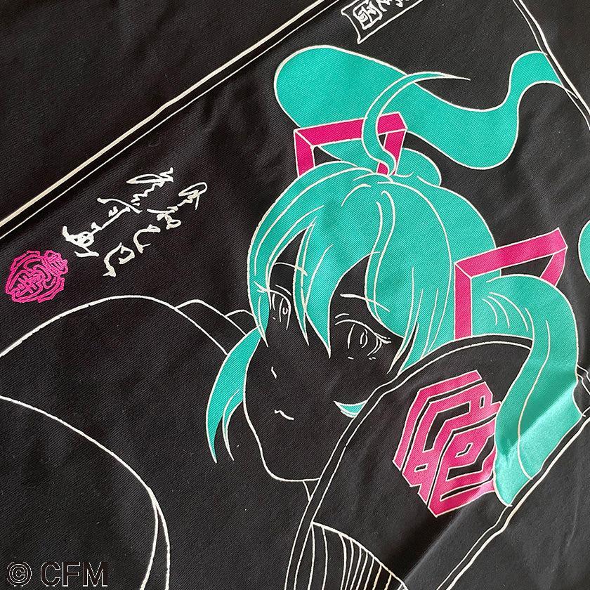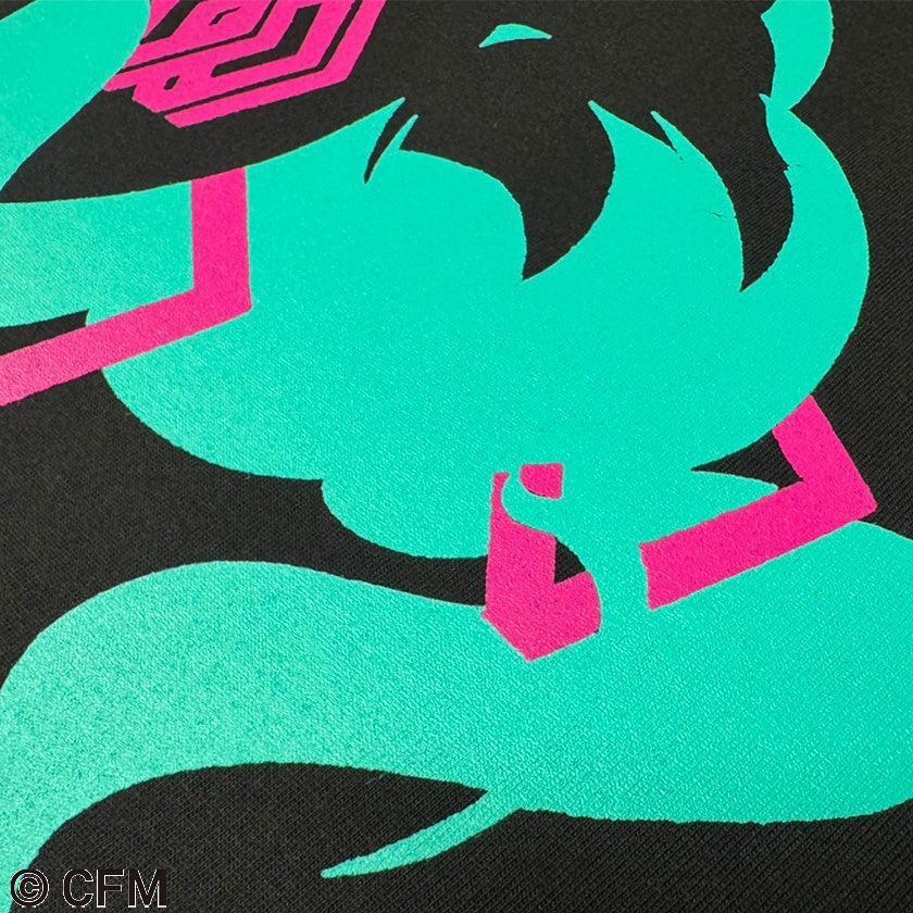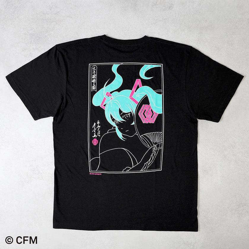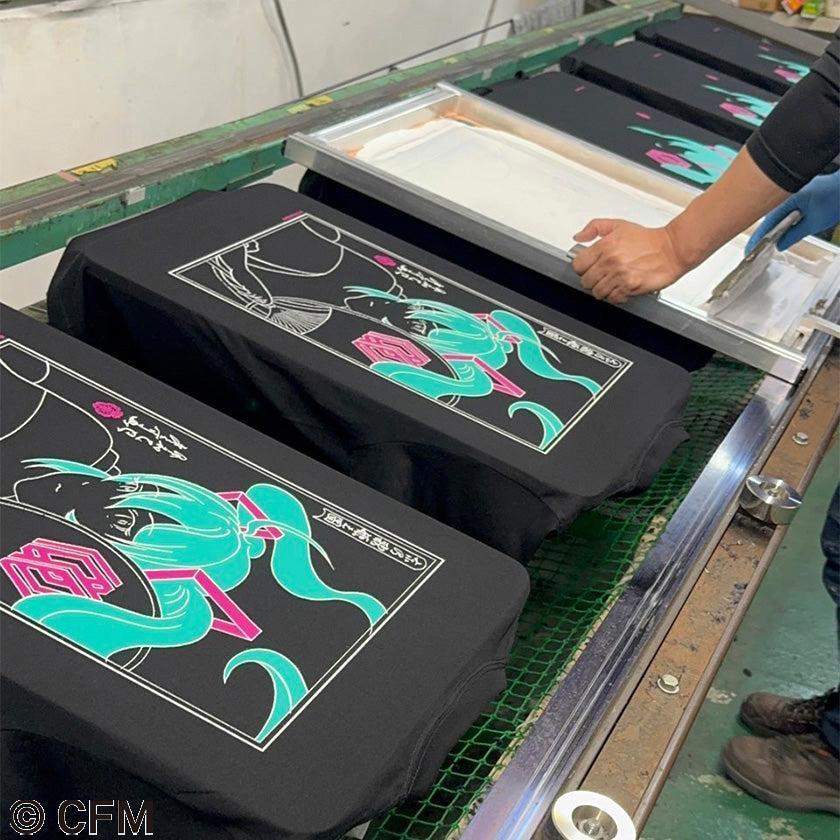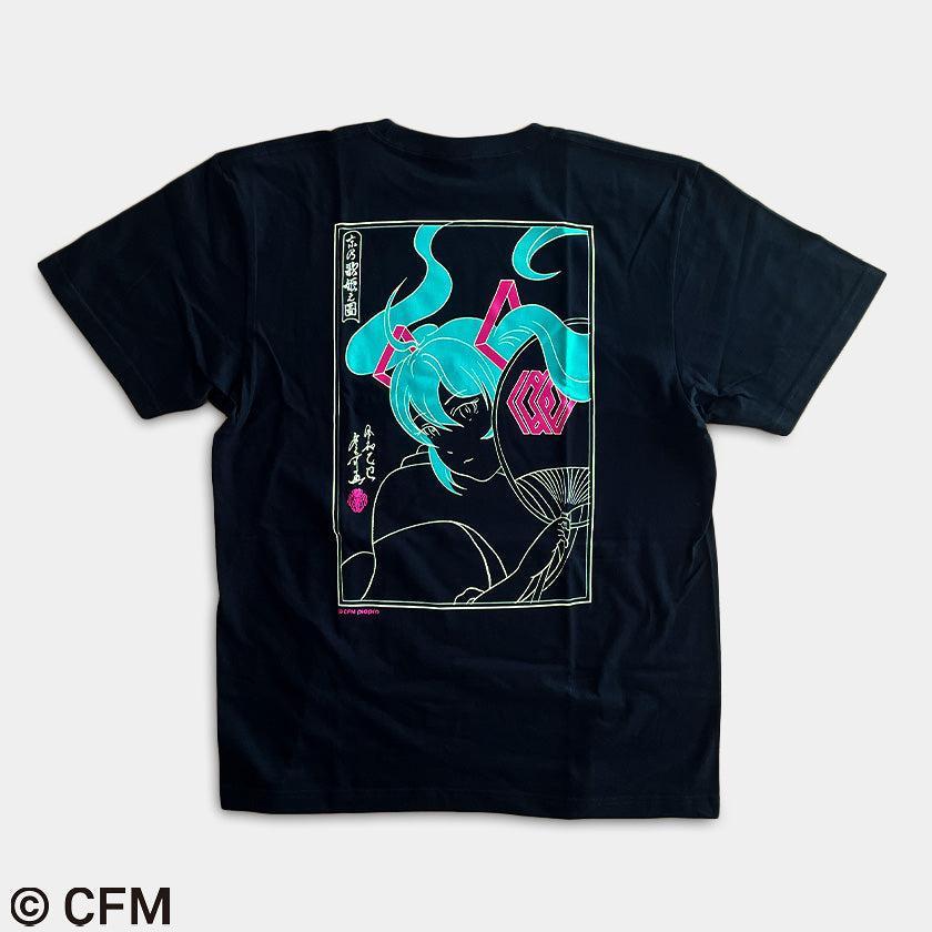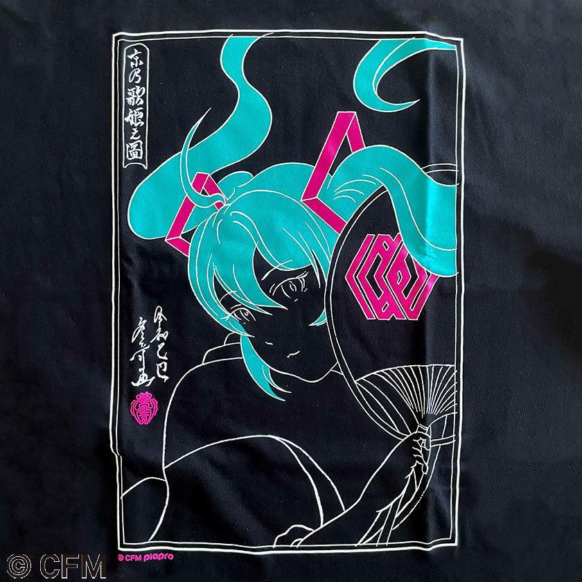 伝統的な手捺染(てなっせん)で職人が1点ずつ作り上げました。ブラックのボディに、ブルーグリーンと光沢ピンクで描かれた「初音ミク」が印象的なTシャツです。