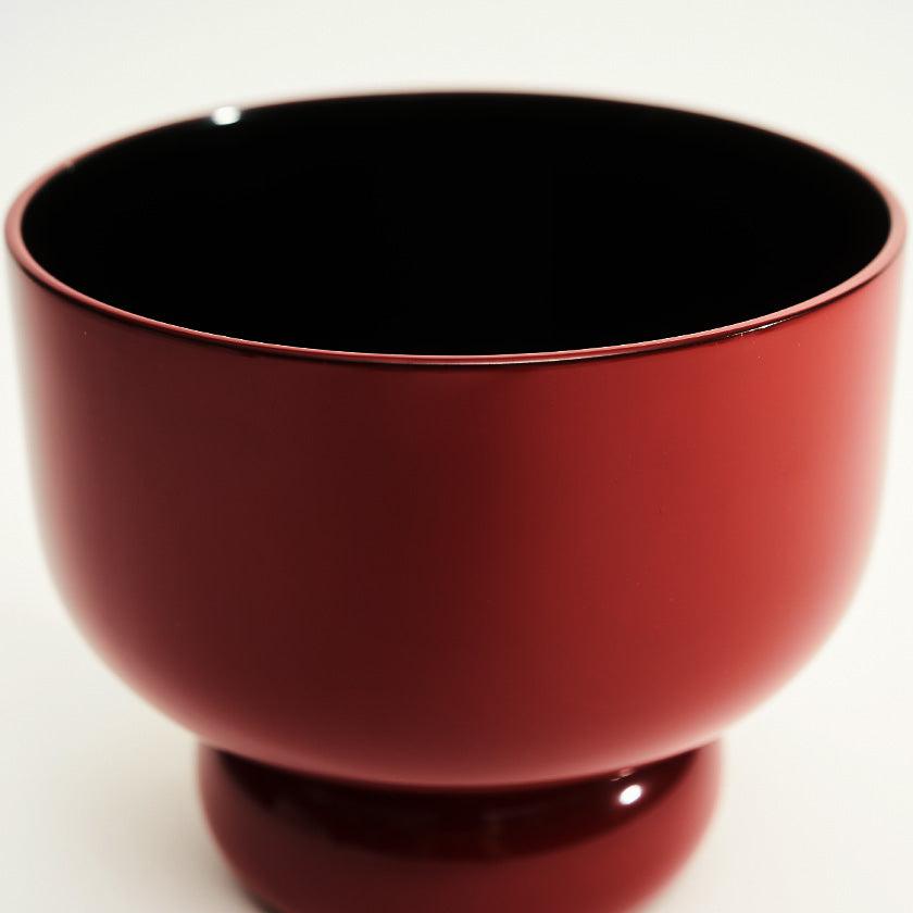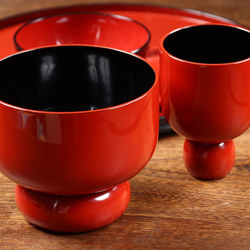 伝統的な丸物木地の技術を駆使したこのアイテムは、木材をろくろで回しながら削り出して作られます。均一で滑らかな表面の曲線が、その技術の高さを物語っていますね。赤と黒のカラーの対比が、シンプルに配された模様を引き立てるデザイン。漆が生み出す上品な光沢もとても美しいですね。