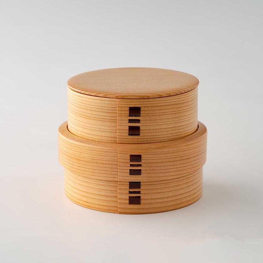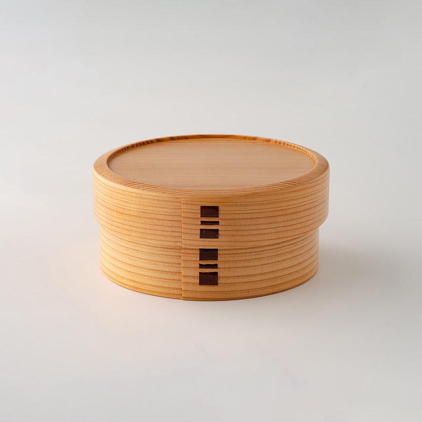 秋田杉のさわやかな香りと木目の美しさを生かした伝統工芸品の丸型弁当箱です。