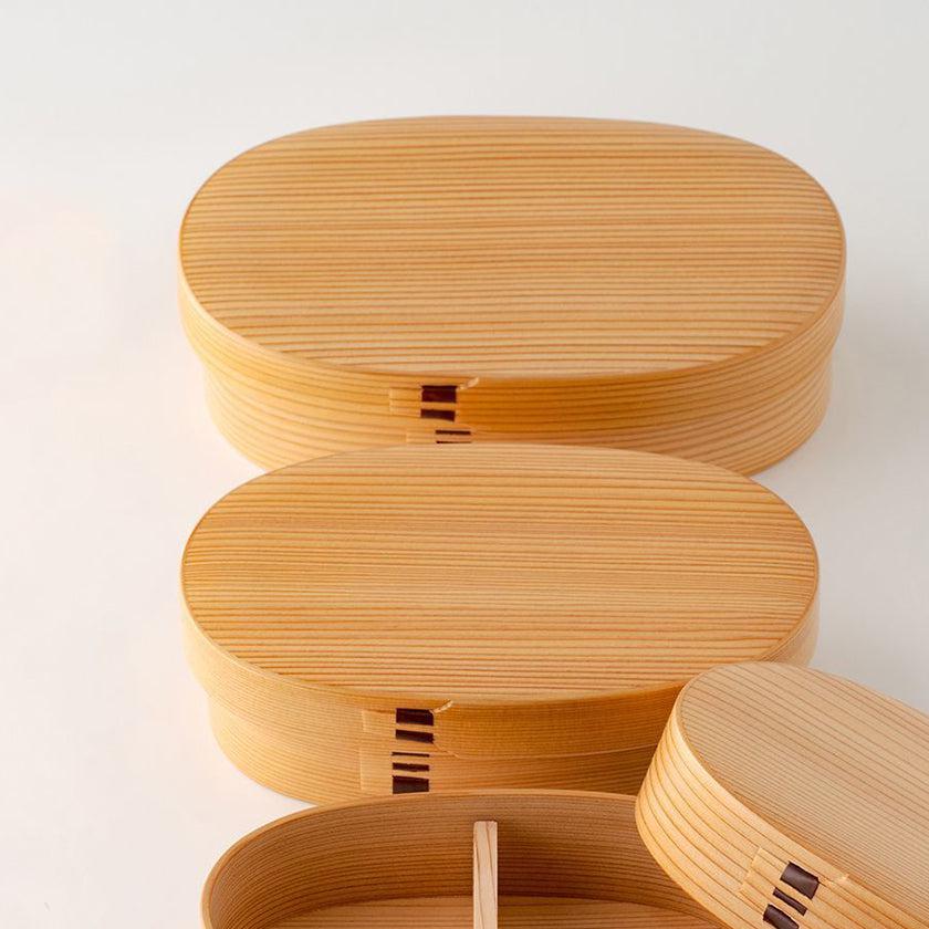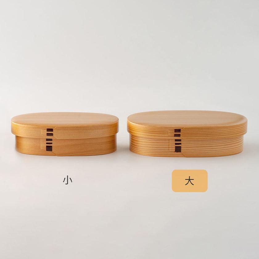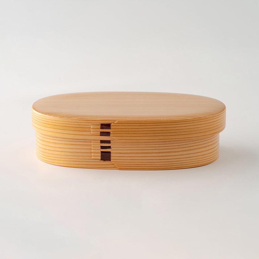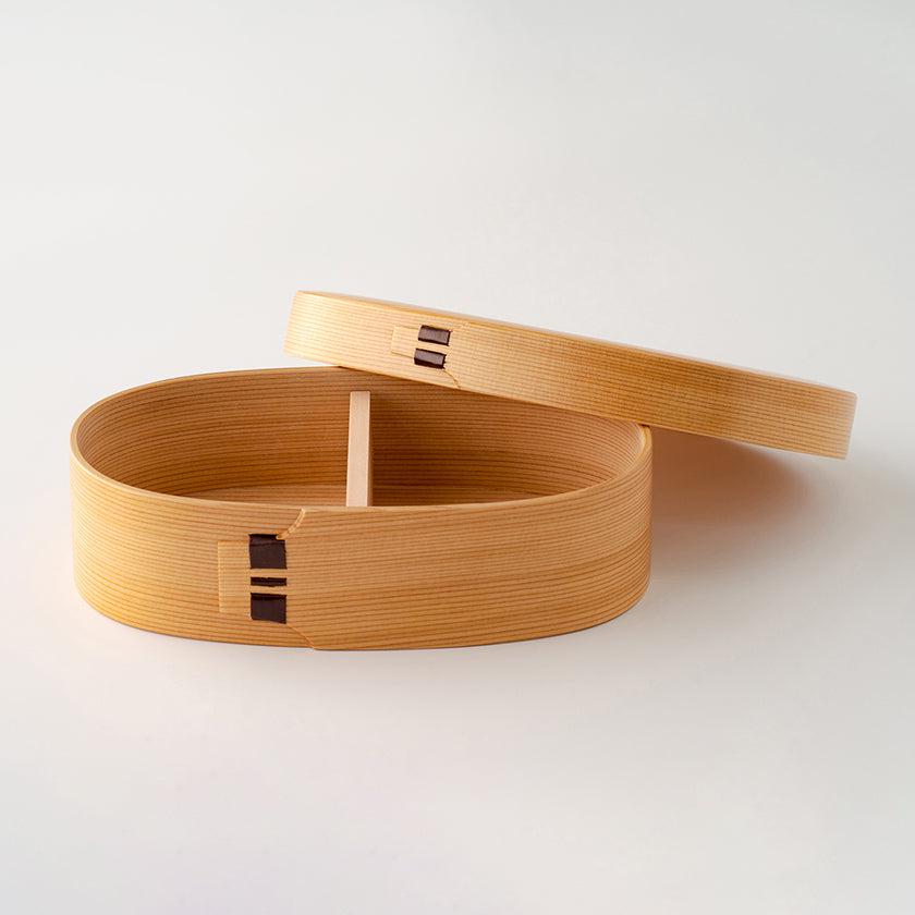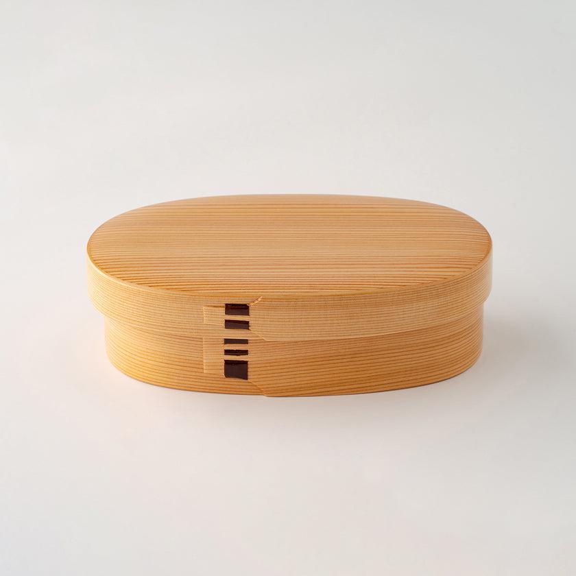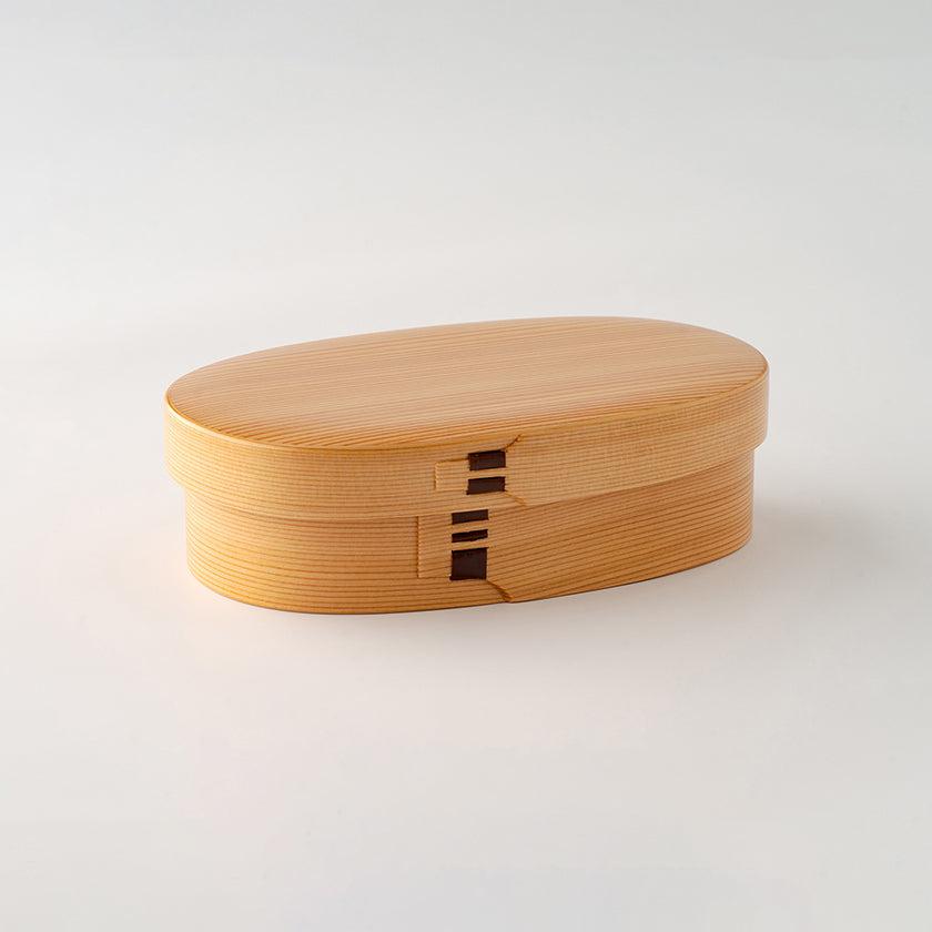秋田杉のさわやかな香りと木目の美しさを生かした伝統工芸品の小判型弁当箱です。