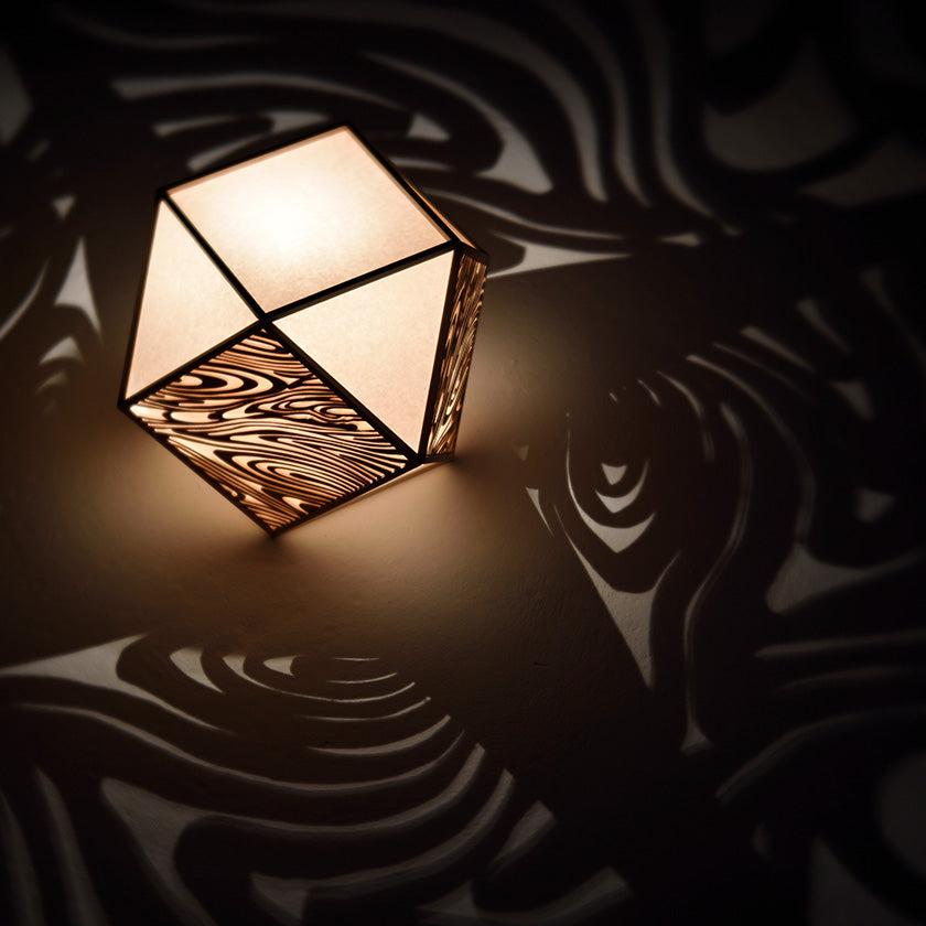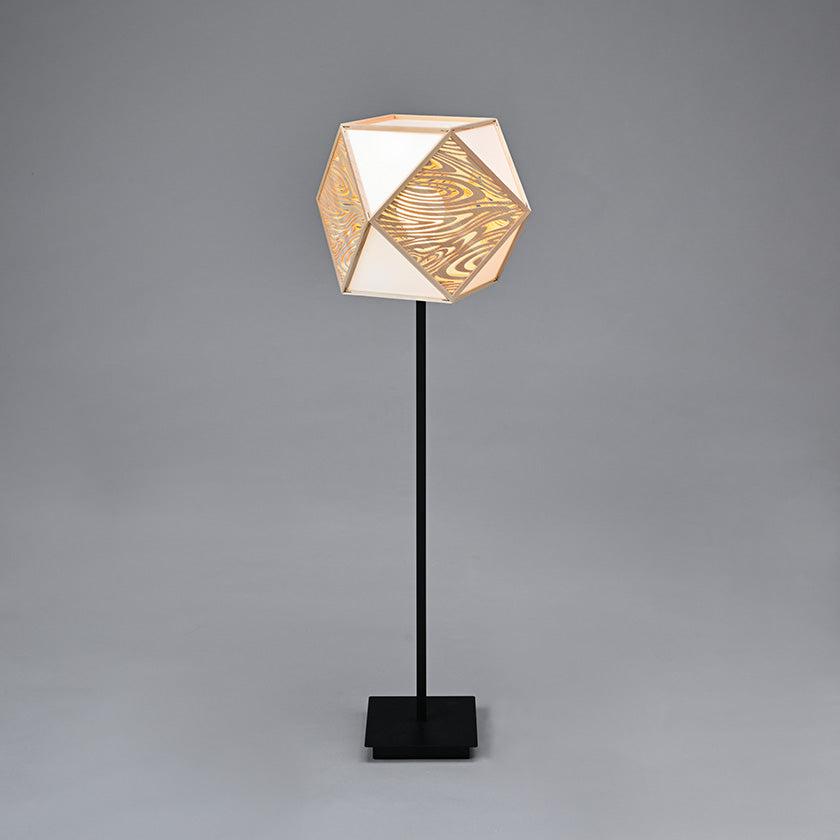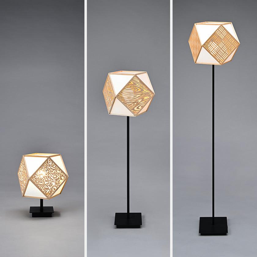 日本の伝統工芸「指物(さしもの)」と「切子(きりこ)」で吉祥文様を表現した趣のあるスタンドライトです。