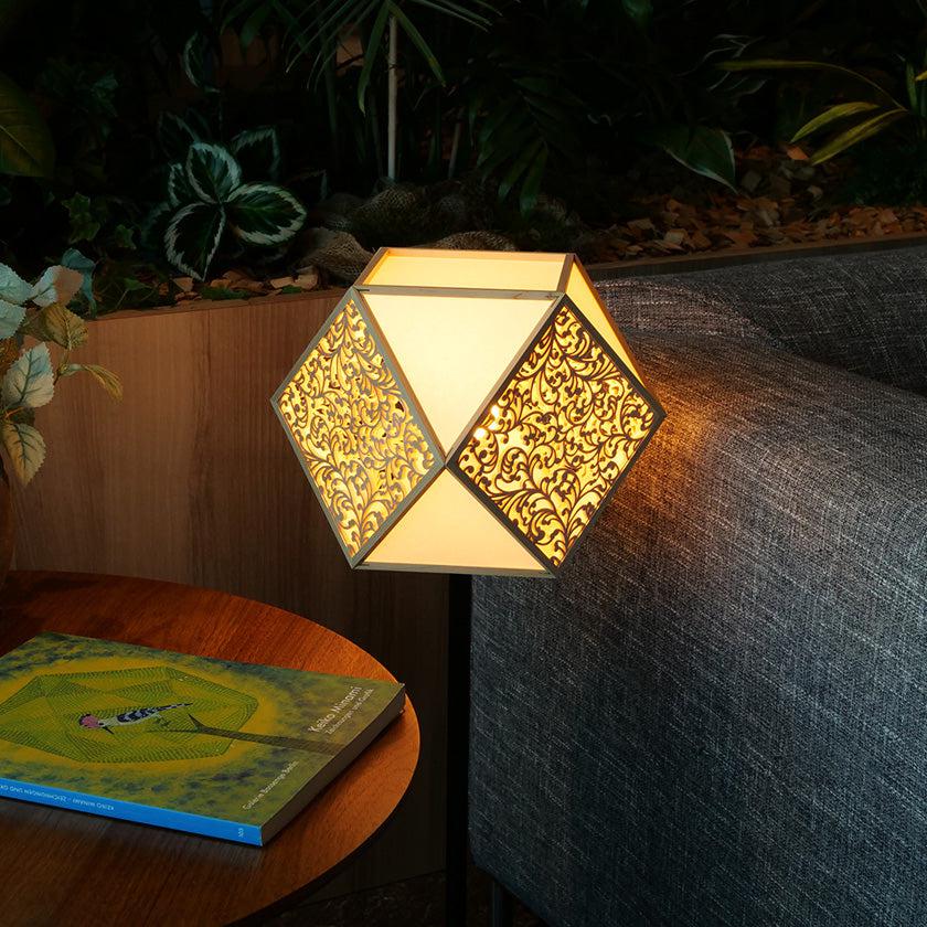 日本の伝統工芸「指物(さしもの)」と「切子(きりこ)」で吉祥文様を表現した趣のあるスタンドライトです。