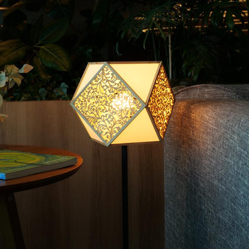 日本の伝統工芸「指物(さしもの)」と「切子(きりこ)」で吉祥文様を表現した趣のあるスタンドライトです。