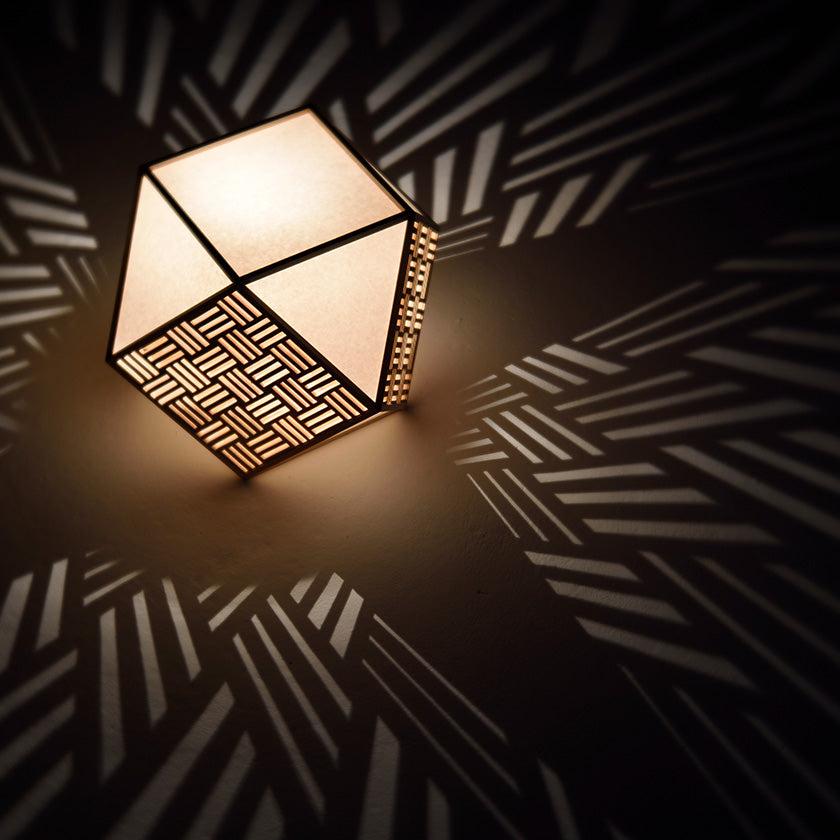 日本の伝統工芸「指物(さしもの)」と「切子(きりこ)」で吉祥文様を表現した趣のあるスタンドライトです。