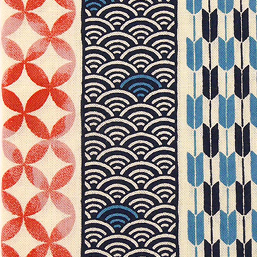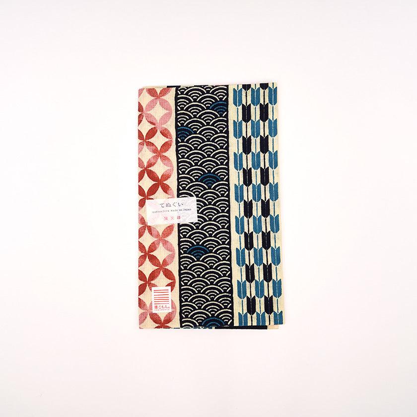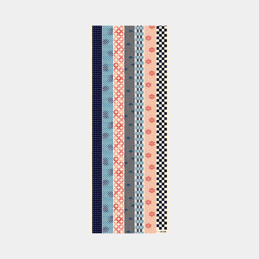 七宝、青海波、矢絣、麻の葉の吉祥文様を縞模様に型染めした鮮やかな横浜捺染のてぬぐいです。