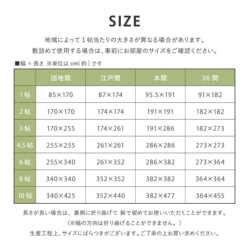 | サイズ (cm) | [団地間] 1畳: W85 * L170 2畳: W170 * L170 3畳: W170 * L255 4.5畳: W255 * L255 6畳: W255 * L340 8畳: W340 * L340 10畳: W340 * L425 [江戸間] 1畳: W87 * L174 2畳: W174 * L174 3畳: W174 * L261 4.5畳: W261 * L261 6畳: W261 * L352 8畳: W352 * L352 10畳: W352 * L440 [36間] 1畳: W91 * L182 2畳: W182 * L182 3畳: W182 * L273 4.5畳: W273 * L273 6畳: W273 * L364 8畳: W364 * L364 10畳: W364 * L455 [本間] 1畳: W95.5 * L191 2畳: W191 * L191 3畳: W191 * L286 4.5畳: W286 * L286 6畳: W286 * L382 8畳: W382 * L382 10畳: W382 * L477 |