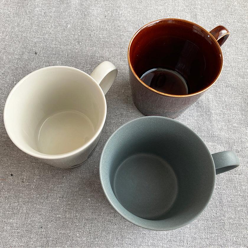 マグカップは3つセットですが、それぞれカラーが異なります。ひとつはスタンダードなホワイト。ひとつはブルーを感じるグレー。最後は赤みを感じるブラウン。ホワイトとブラウンは艶のある質感で、グレーのみマットな質感です。
