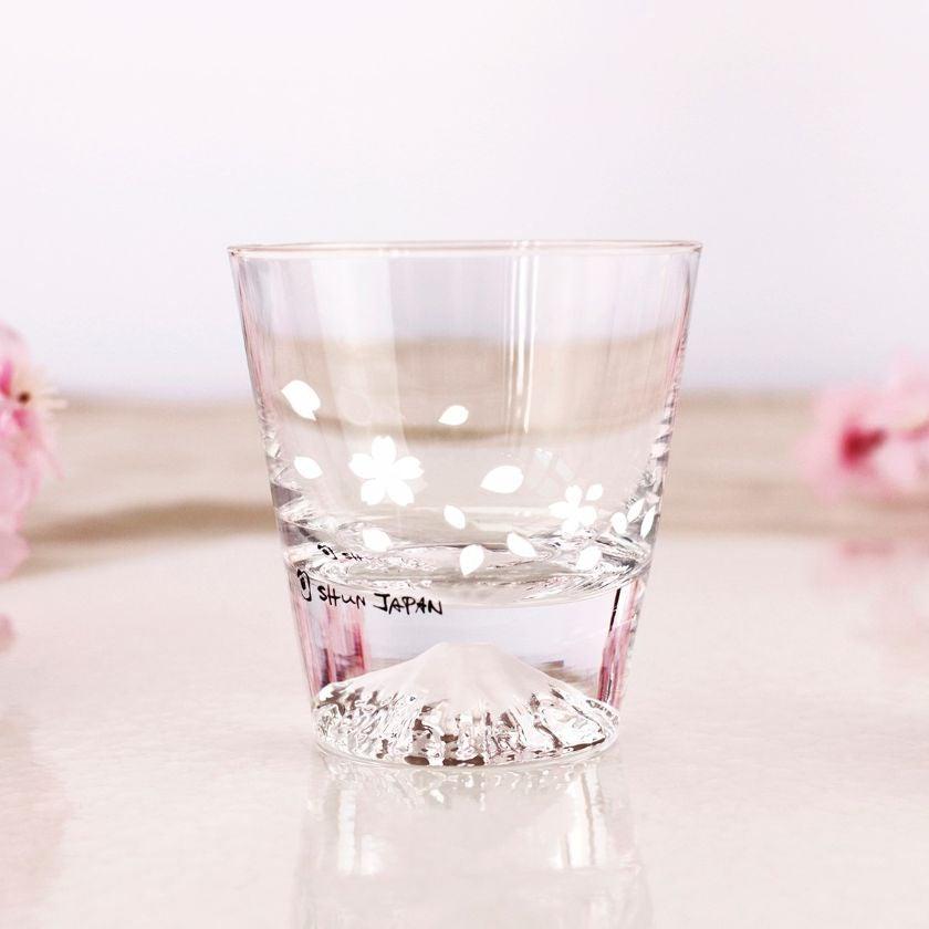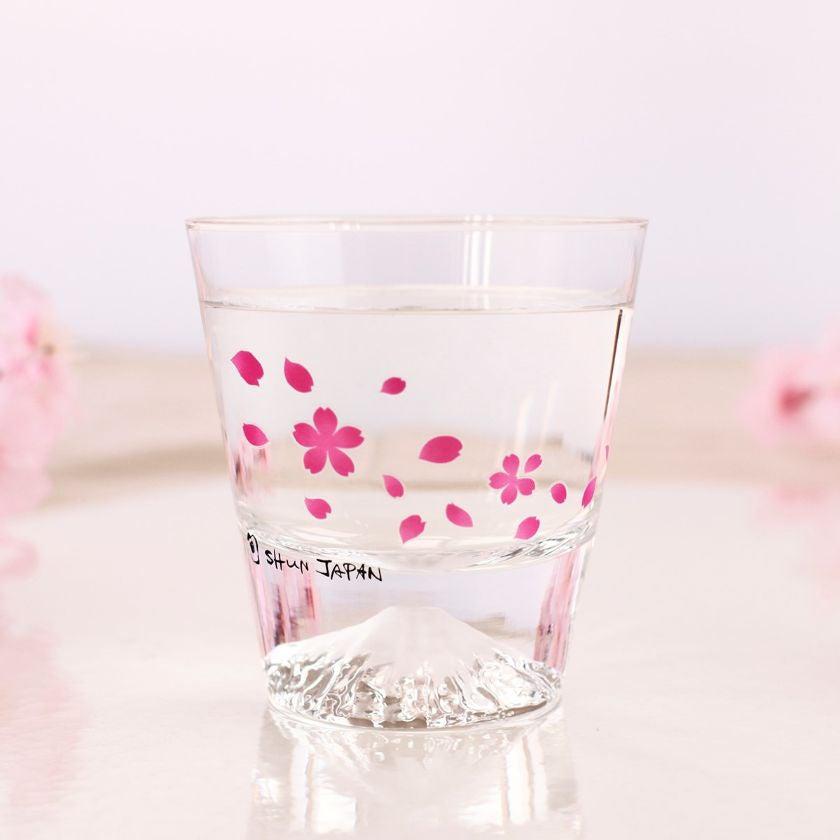グラスの底にはそびえ立つ富士山、グラスの側面には桜の花と花びらが舞う美しいグラスです。飲み物を注ぐと、白い桜の花が鮮やかなピンク色に変化します。
