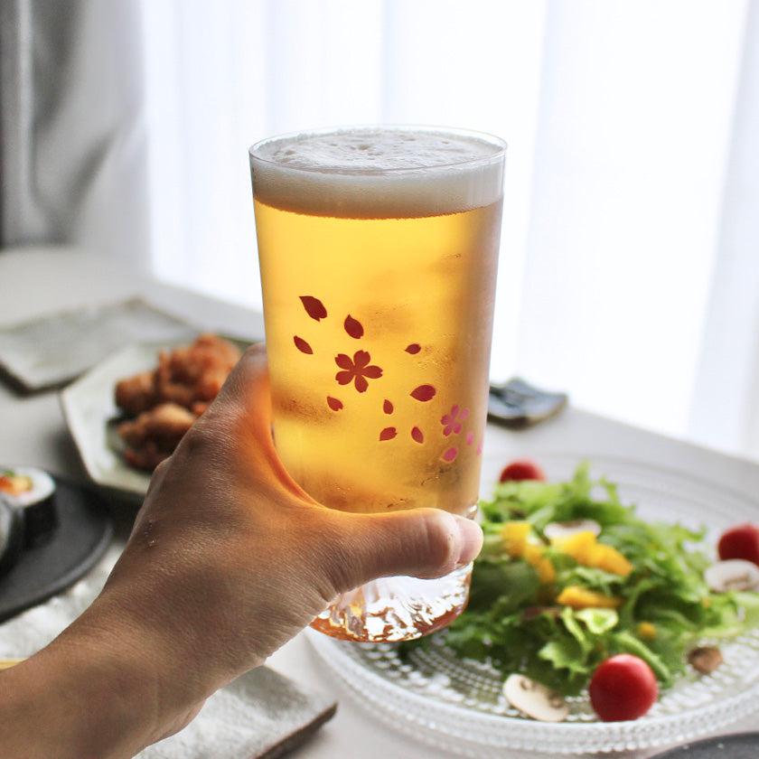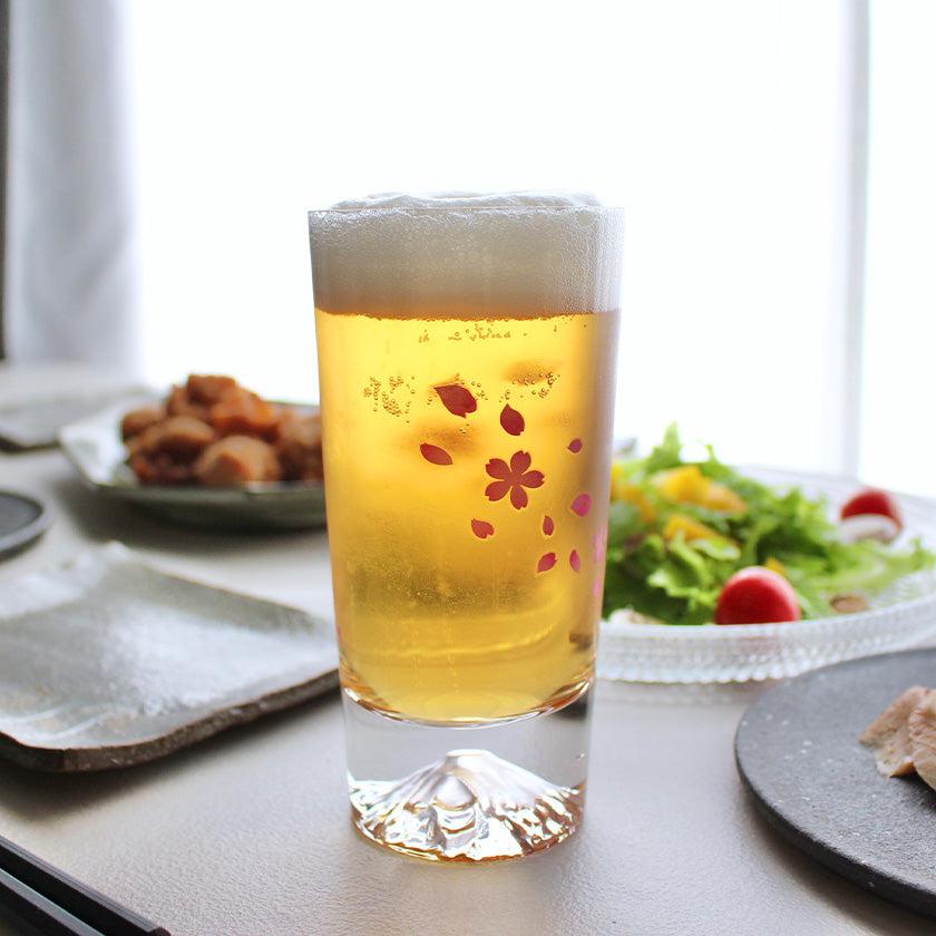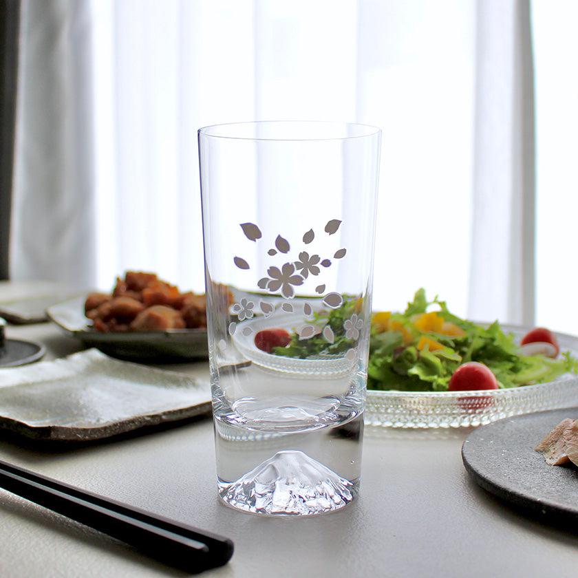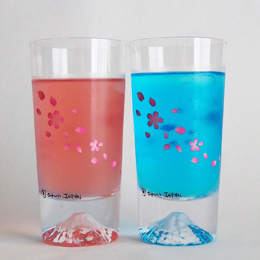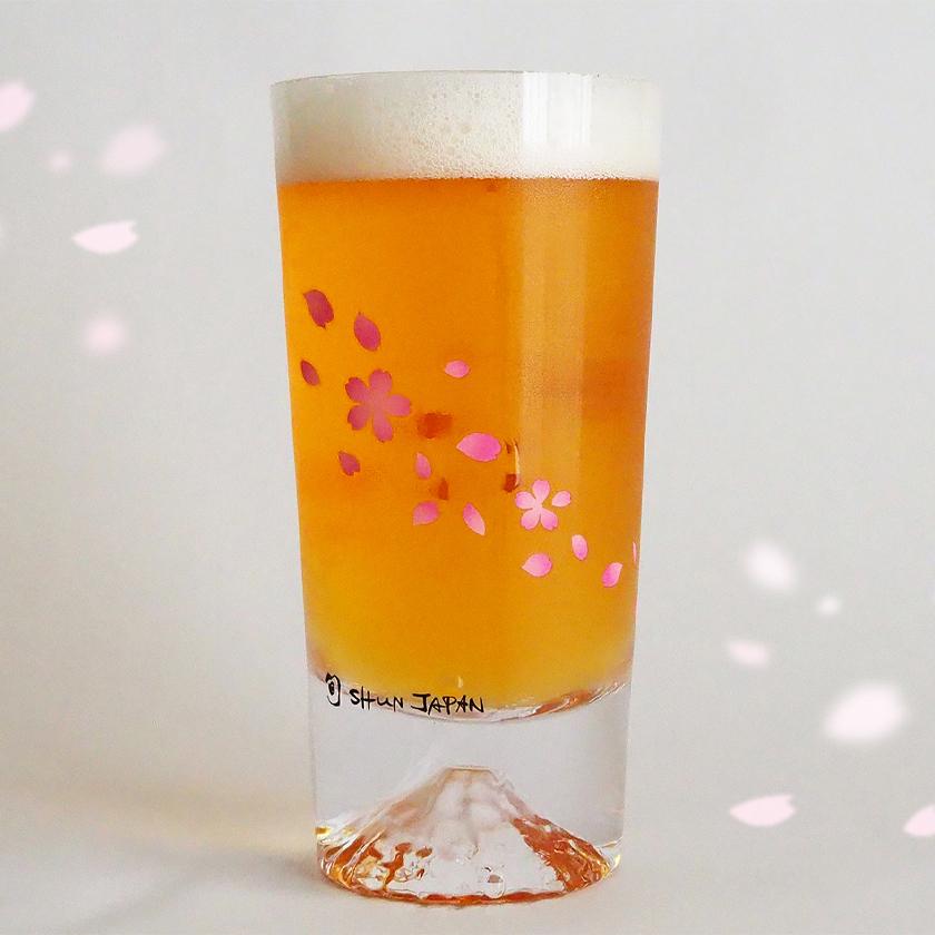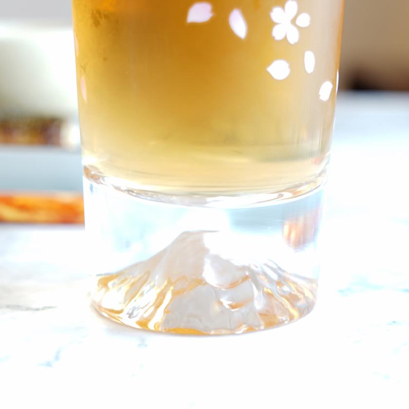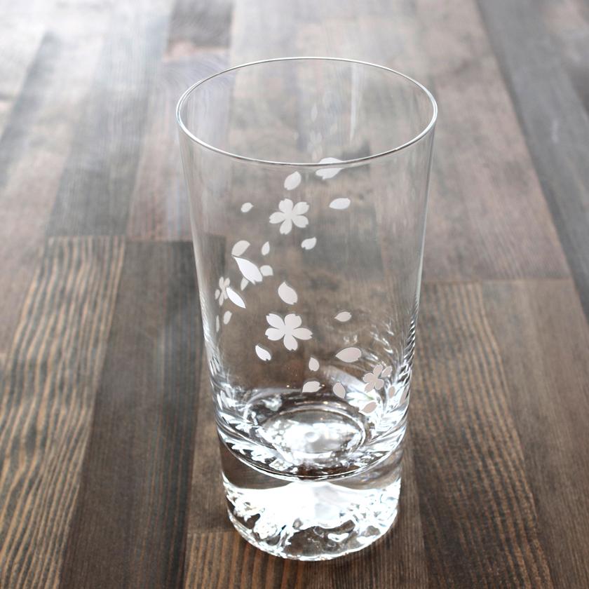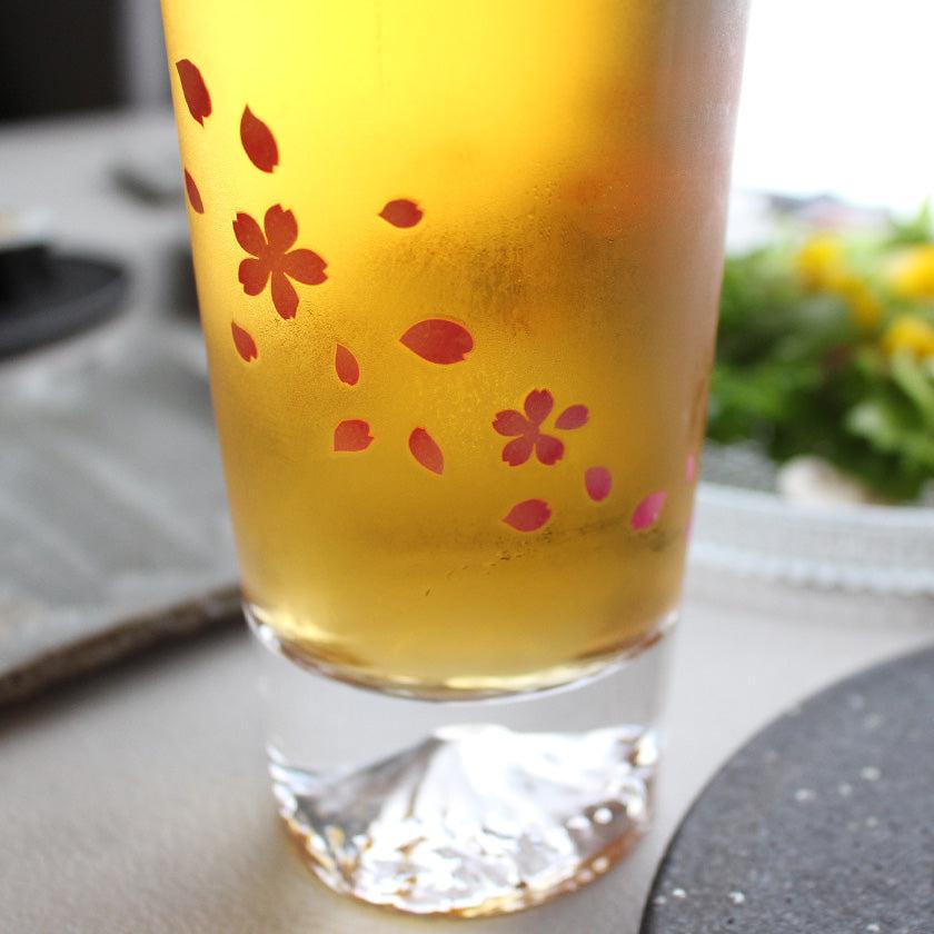 グラスの底にはそびえ立つ富士山、グラスの側面には桜の花と花びらが舞う美しいグラスです。飲み物を注ぐと、白い桜の花が鮮やかなピンク色に変化します。