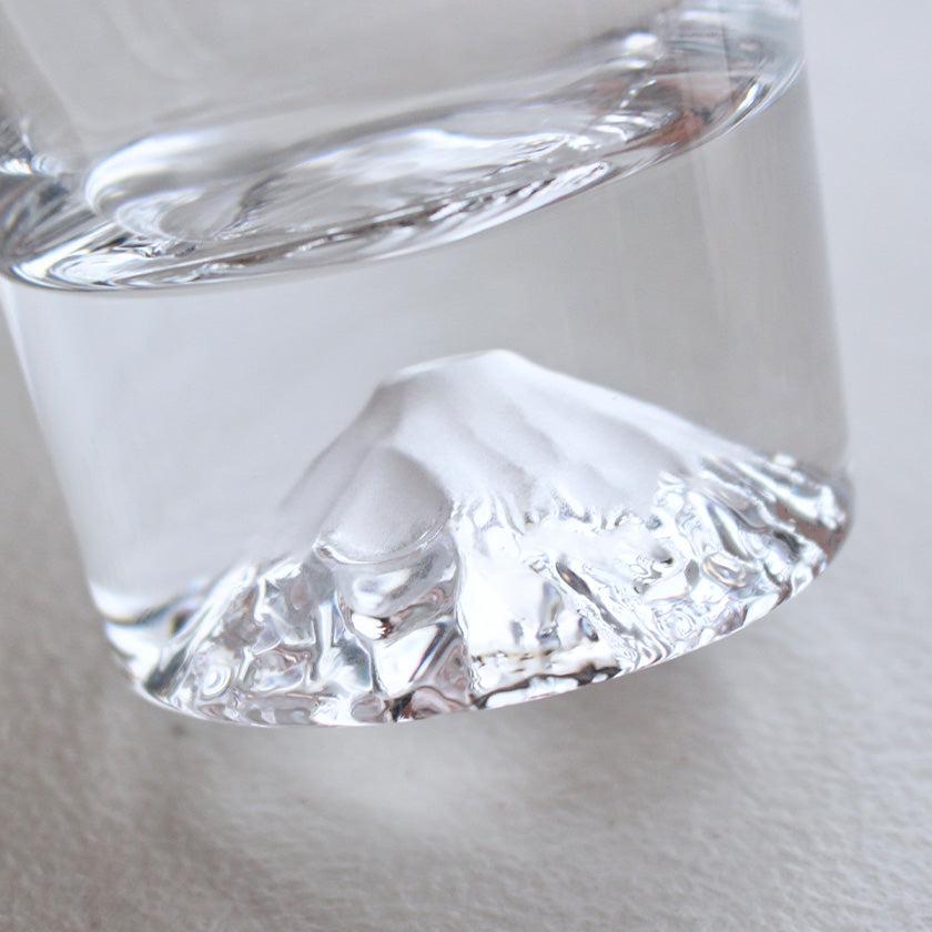 立体的に見える富士山は、グラスの底からぐっと深く彫られた形状。山肌の凹凸や、雪化粧をしているようなマットな質感がとてもリアル。