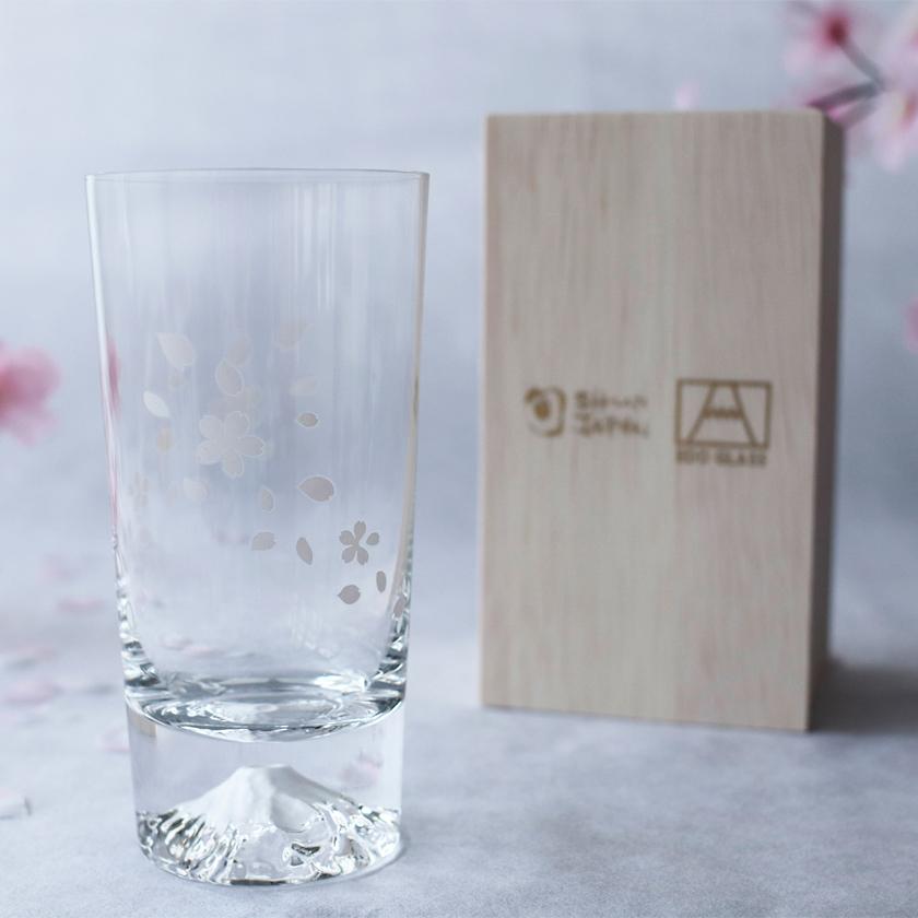 冷感シリーズの人気タンブラーです。グラスの底には江戸硝子の技術を駆使した富士山モチーフが施されていてオリジナリティに溢れた逸品。冷たい飲み物で色付く桜と相まって華やかで豪華な印象です。高級感あふれる木箱入りで、お祝いギフトなどにもぴったりですよ。