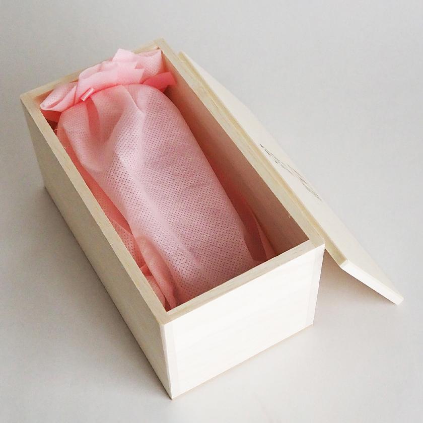 グラスはピンクの不織布の袋とオリジナルの木箱に入って届きます。さらに、薄いブルーのボール紙の帯がかかっていて、高級感に溢れています