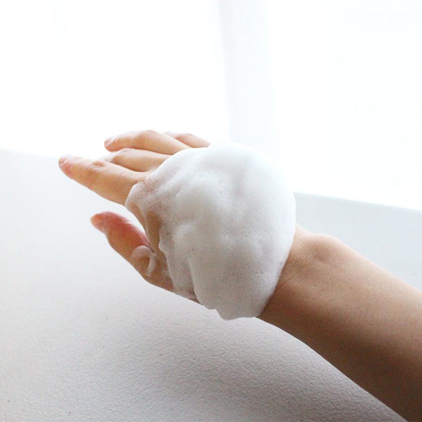 泡立てネットを使って泡立てると、きめ細かな泡が出来上がります。手のひらや手の甲に置いてみても、流れることなく形を保ってくれるしっかりとした質感。