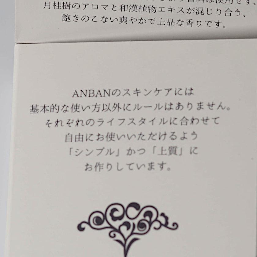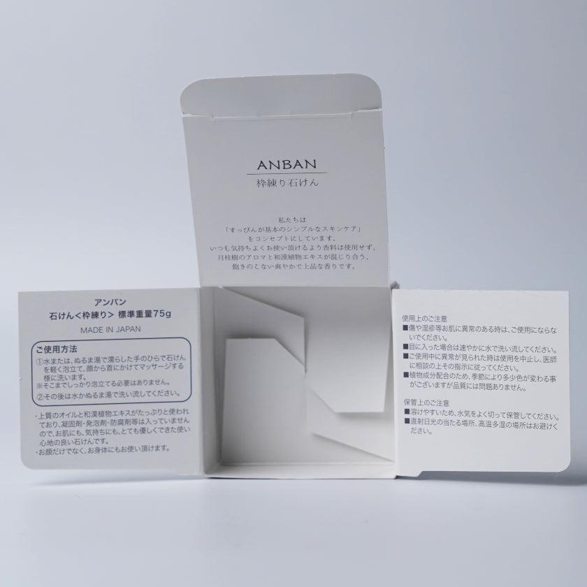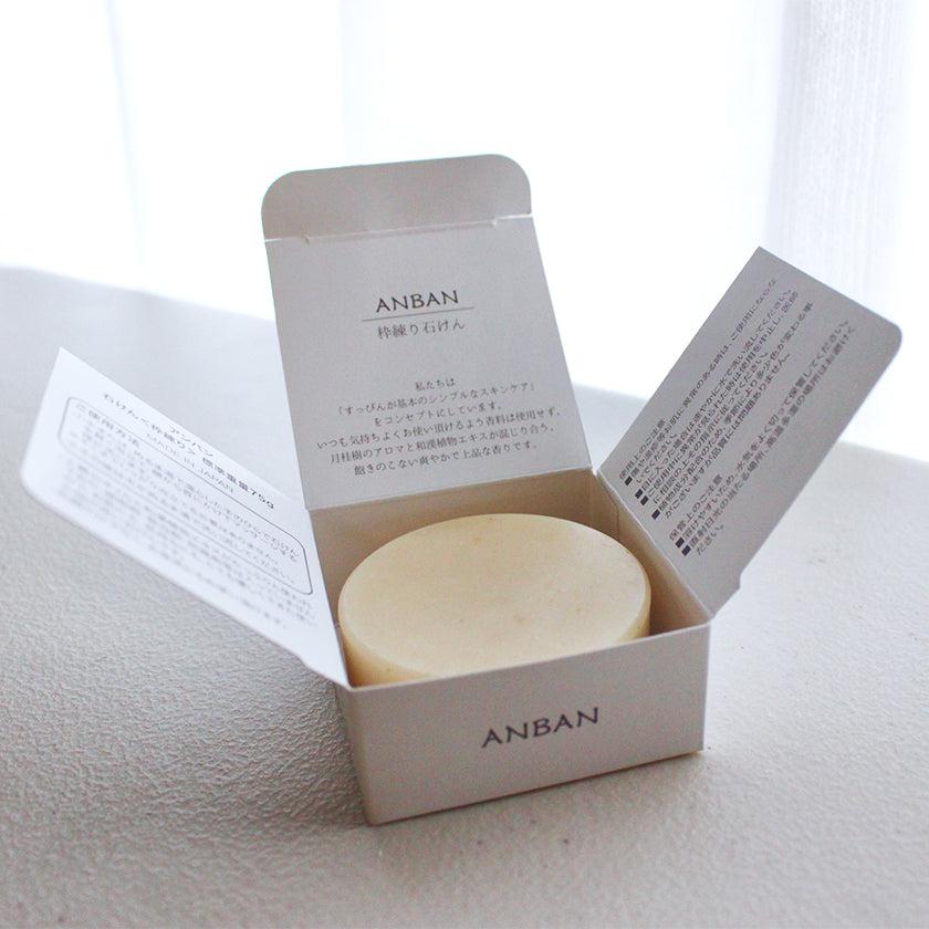 和漢植物を使ったスキンケアアイテムシリーズ、ANBAN(アンバン)の石鹸。凝固剤・防腐剤・発泡剤・人工香料などの添加物は不使用で、植物由来成分をたっぷり使ったアイテム。