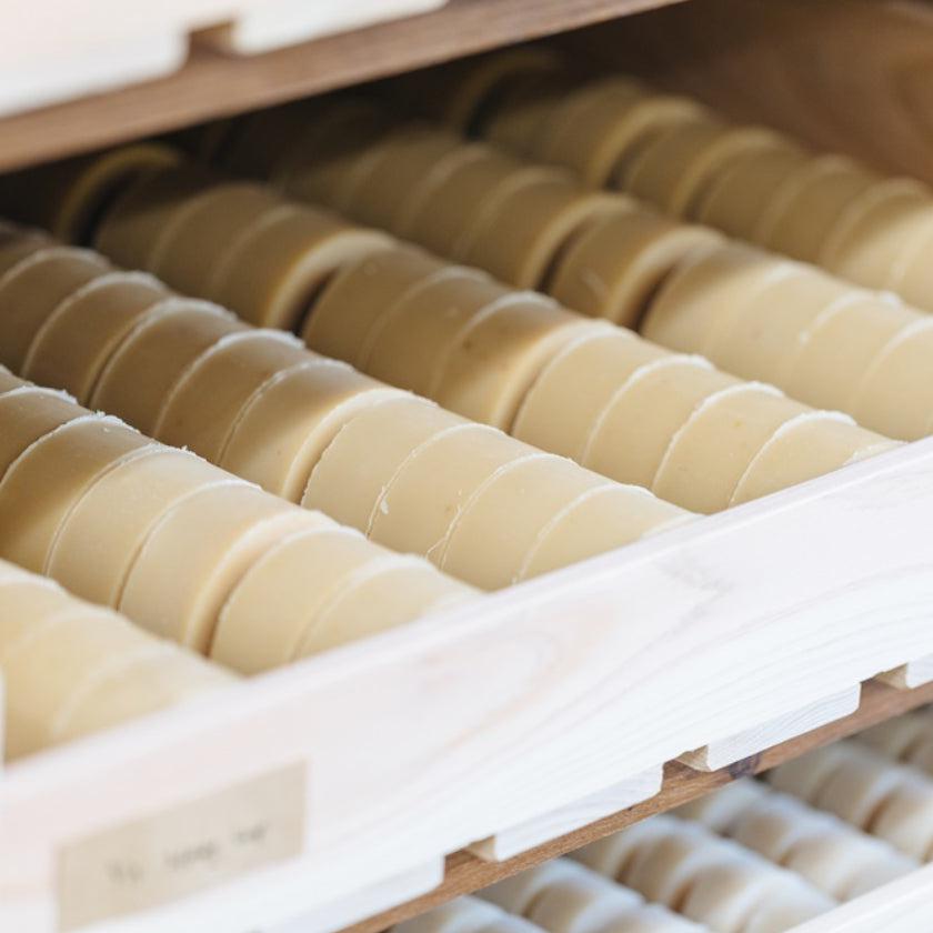 また素材を枠に流し込んで固める「枠練り」という製法を用いていて、ひとつひとつが手作り。市販の石鹸に多い「機械練り」製法に比べて、枠練り石けんは石鹸素地(ベース)以外の成分を多く配合することができるのがメリット。そのため、この石鹸には素地以外の自然由来の有効成分が多く含まれています。