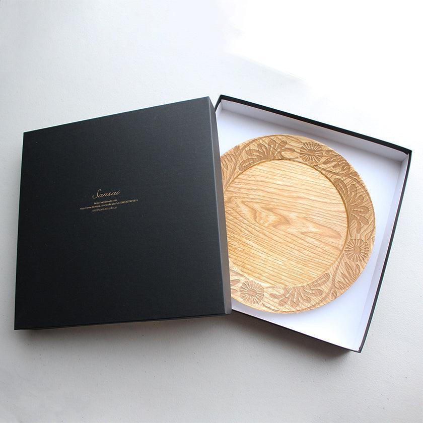 花の文様を彫刻によって施した、やさしい印象のお皿。花はリムにのみ描かれているため、木目の美しさも際立つ逸品です。