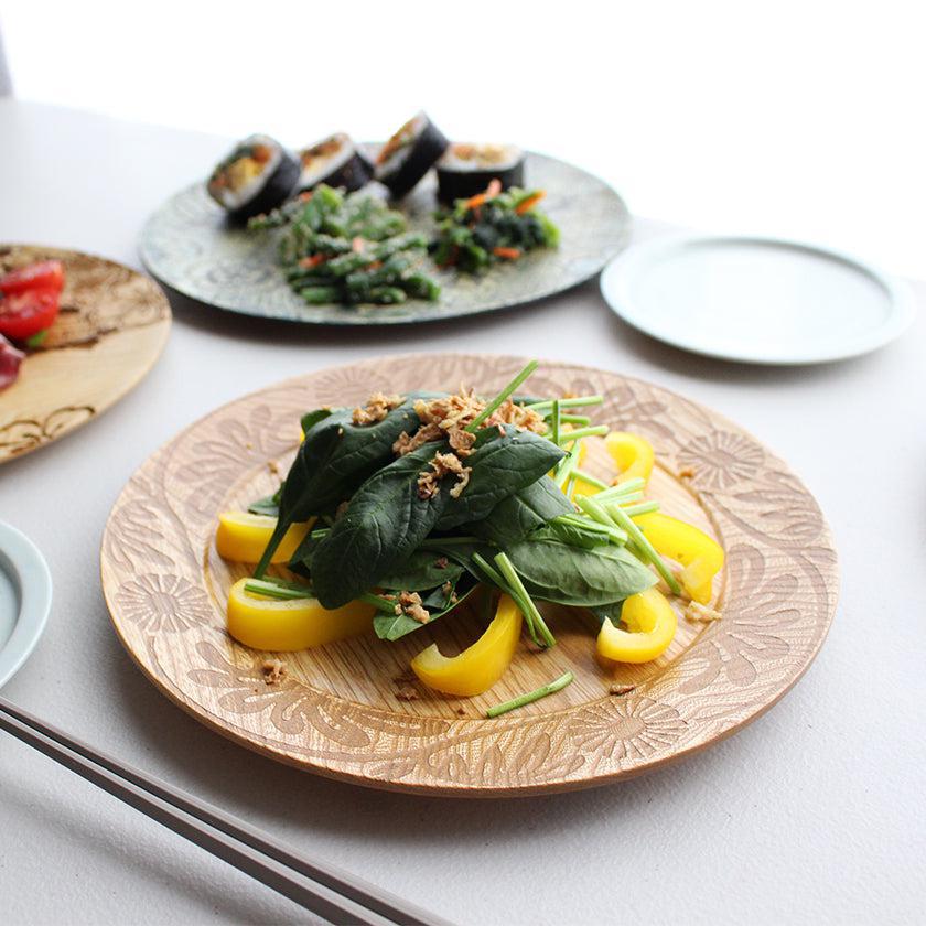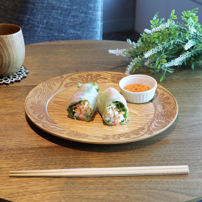 美しい木目と相まって、独特の趣深さを感じるお皿。和のイメージ・洋のイメージ、またオリエンタルなイメージなどさまざまな印象を併せ持っていて、使い方次第で雰囲気を変えて楽しめそうです。