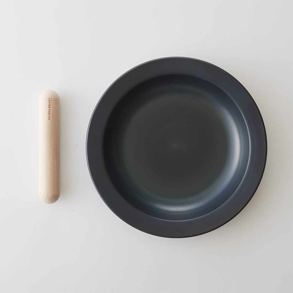 フライパンJIUをもっと使いやすくしてくれる専用の蓋、鍋敷きも展開されています。別売りの蓋は、マットな質感の黒塗装と無垢材の持ち手の組み合わせがとてもおしゃれ。S~Lサイズそれぞれ専用のものが用意されていて、フライパン全体をぴったりと覆えるようになっています。